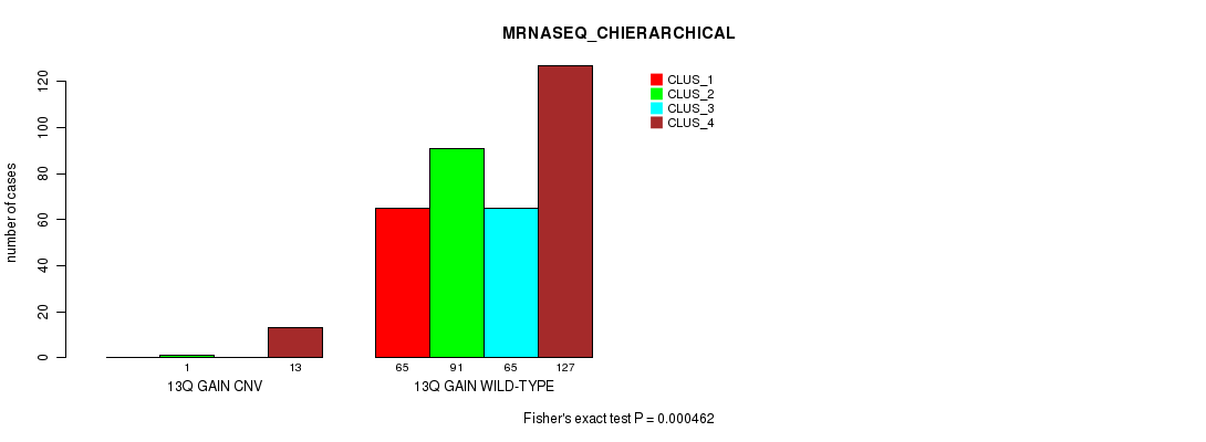 13q gain cnv correlated to 'CN_CNMF', 'MRNASEQ_CNMF', 'MRNASEQ_CHIERARCHICAL', 'MIRSEQ_CNMF', and 'MIRSEQ_CHIERARCHICAL'.