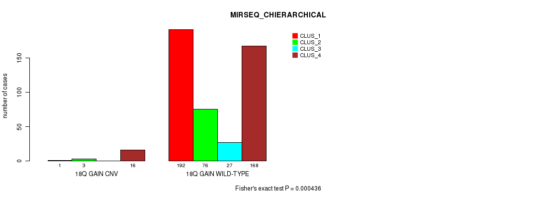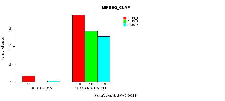 18q gain cnv correlated to 'CN_CNMF', 'MIRSEQ_CNMF', and 'MIRSEQ_CHIERARCHICAL'.