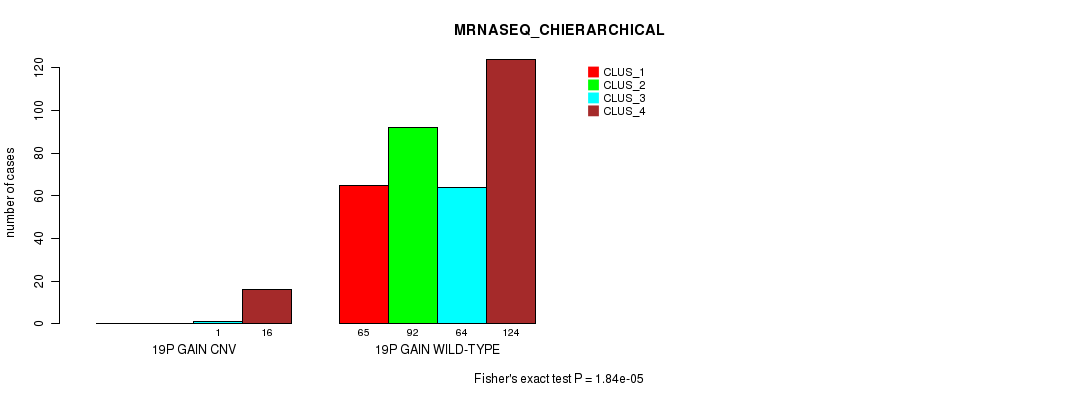 19p gain cnv correlated to 'CN_CNMF', 'MRNASEQ_CNMF', 'MRNASEQ_CHIERARCHICAL', 'MIRSEQ_CNMF', and 'MIRSEQ_CHIERARCHICAL'.
