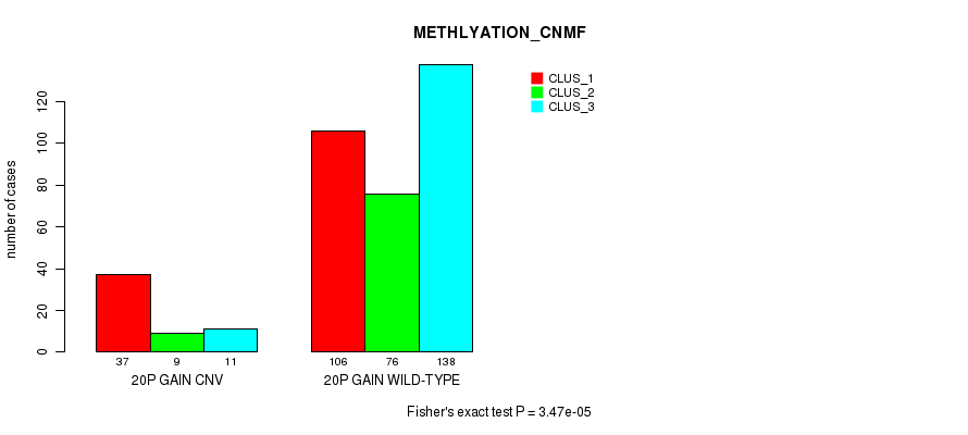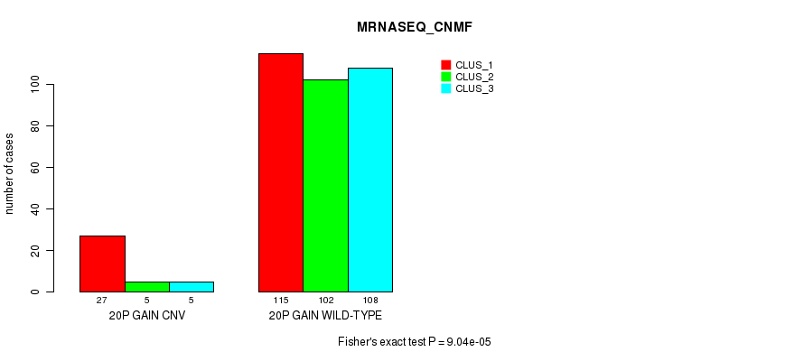 20p gain cnv correlated to 'CN_CNMF', 'METHLYATION_CNMF', 'MRNASEQ_CNMF', 'MIRSEQ_CNMF', and 'MIRSEQ_CHIERARCHICAL'.