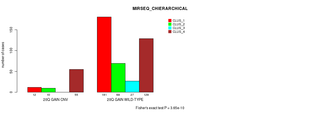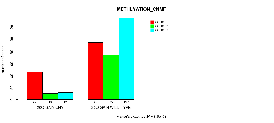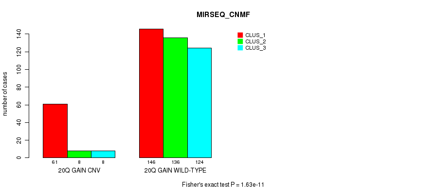 20q gain cnv correlated to 'CN_CNMF', 'METHLYATION_CNMF', 'MRNASEQ_CNMF', 'MIRSEQ_CNMF', and 'MIRSEQ_CHIERARCHICAL'.