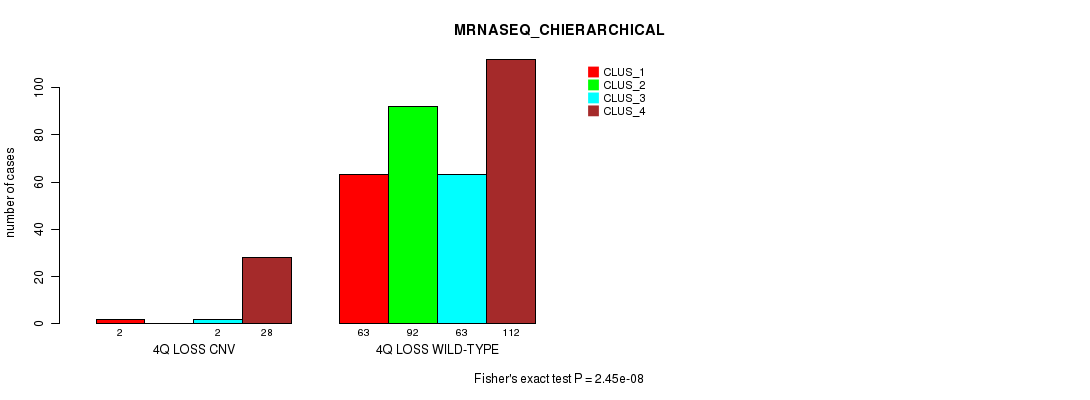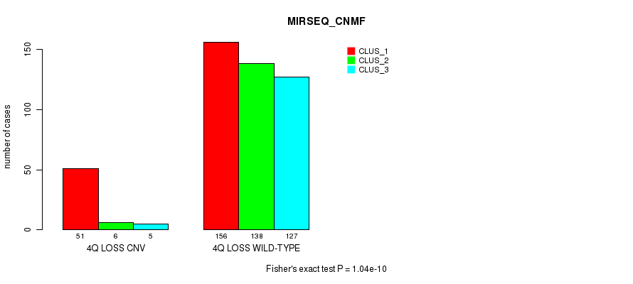 4q loss cnv correlated to 'CN_CNMF', 'METHLYATION_CNMF', 'MRNASEQ_CNMF', 'MRNASEQ_CHIERARCHICAL', 'MIRSEQ_CNMF', and 'MIRSEQ_CHIERARCHICAL'.