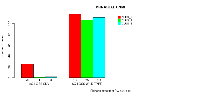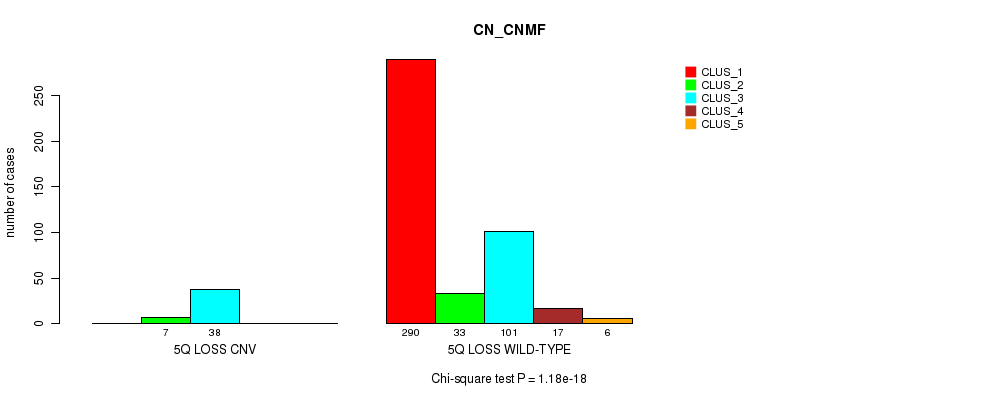5q loss cnv correlated to 'CN_CNMF', 'METHLYATION_CNMF', 'MRNASEQ_CNMF', 'MRNASEQ_CHIERARCHICAL', 'MIRSEQ_CNMF', and 'MIRSEQ_CHIERARCHICAL'.