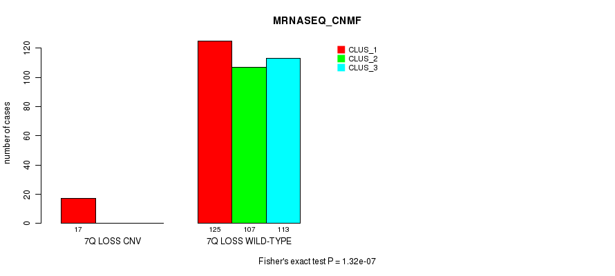 7q loss cnv correlated to 'CN_CNMF', 'METHLYATION_CNMF', 'MRNASEQ_CNMF', 'MRNASEQ_CHIERARCHICAL', 'MIRSEQ_CNMF', and 'MIRSEQ_CHIERARCHICAL'.