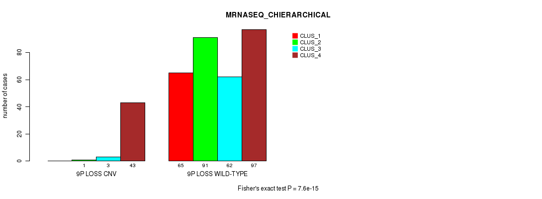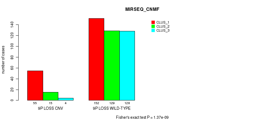 9p loss cnv correlated to 'CN_CNMF', 'METHLYATION_CNMF', 'MRNASEQ_CNMF', 'MRNASEQ_CHIERARCHICAL', 'MIRSEQ_CNMF', and 'MIRSEQ_CHIERARCHICAL'.