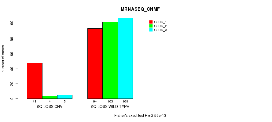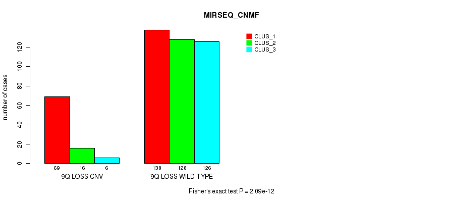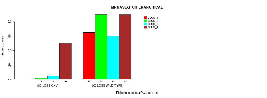 9q loss cnv correlated to 'MRNA_CHIERARCHICAL', 'CN_CNMF', 'METHLYATION_CNMF', 'MRNASEQ_CNMF', 'MRNASEQ_CHIERARCHICAL', 'MIRSEQ_CNMF', and 'MIRSEQ_CHIERARCHICAL'.