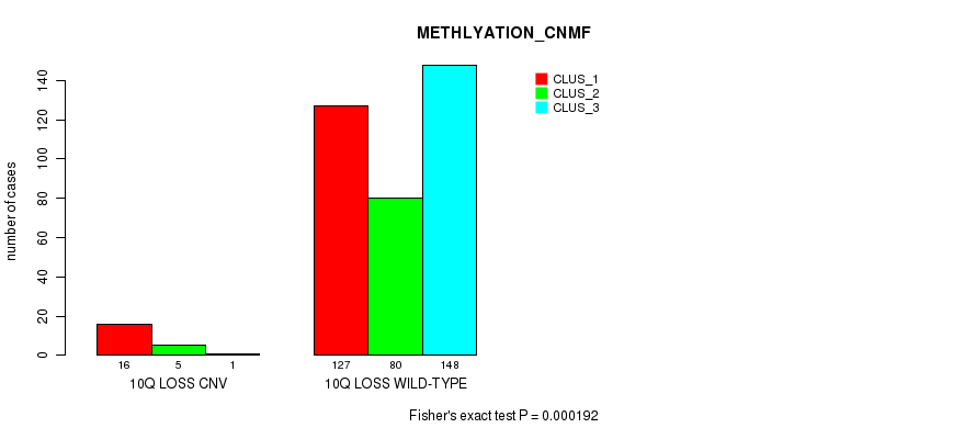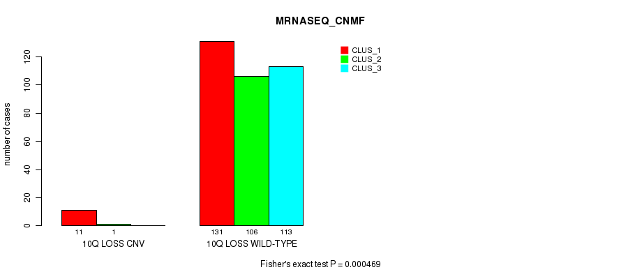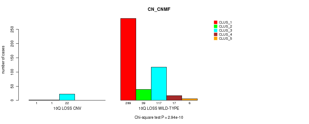 10q loss cnv correlated to 'CN_CNMF', 'METHLYATION_CNMF', 'MRNASEQ_CNMF', and 'MIRSEQ_CNMF'.