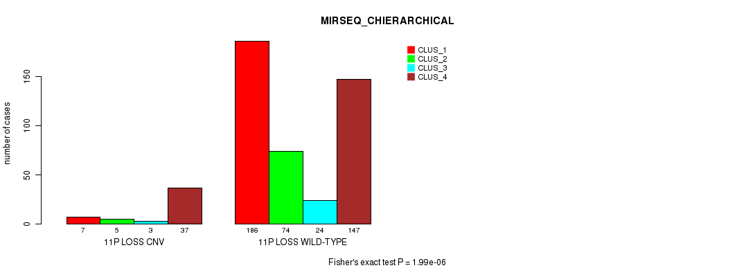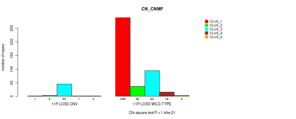 11p loss cnv correlated to 'CN_CNMF', 'METHLYATION_CNMF', 'MRNASEQ_CNMF', 'MRNASEQ_CHIERARCHICAL', 'MIRSEQ_CNMF', and 'MIRSEQ_CHIERARCHICAL'.