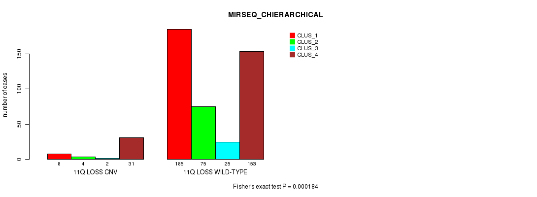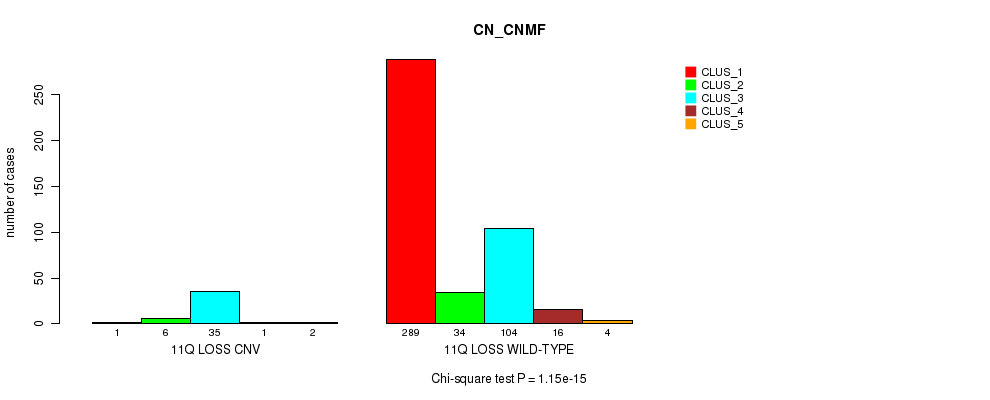 11q loss cnv correlated to 'CN_CNMF', 'METHLYATION_CNMF', 'MRNASEQ_CNMF', 'MRNASEQ_CHIERARCHICAL', 'MIRSEQ_CNMF', and 'MIRSEQ_CHIERARCHICAL'.