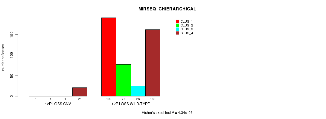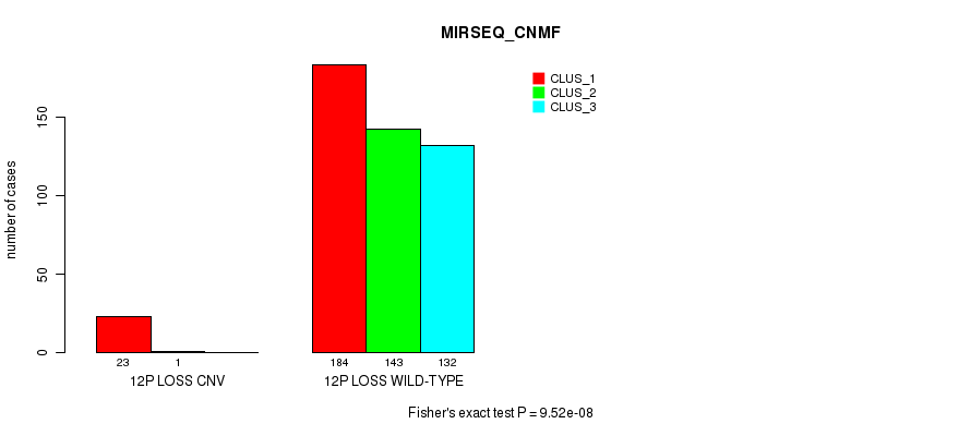 12p loss cnv correlated to 'CN_CNMF', 'METHLYATION_CNMF', 'MRNASEQ_CNMF', 'MIRSEQ_CNMF', and 'MIRSEQ_CHIERARCHICAL'.