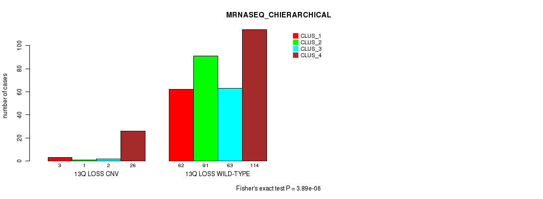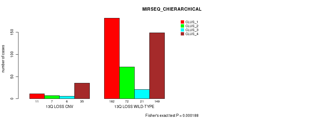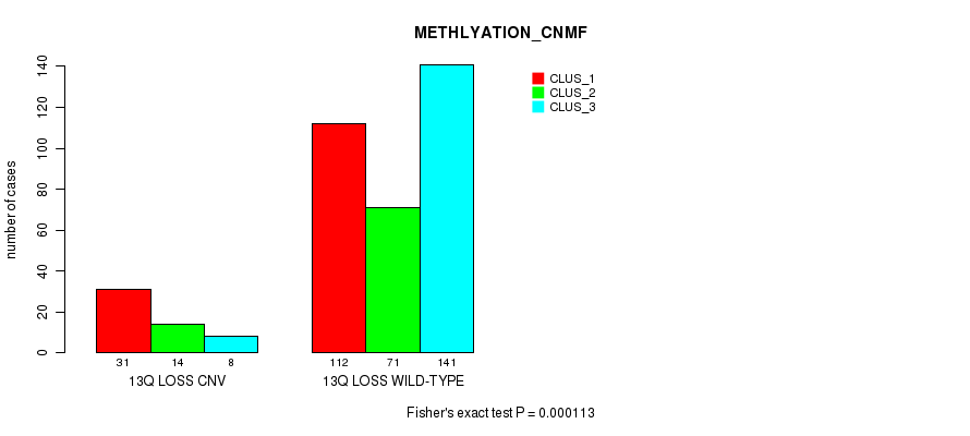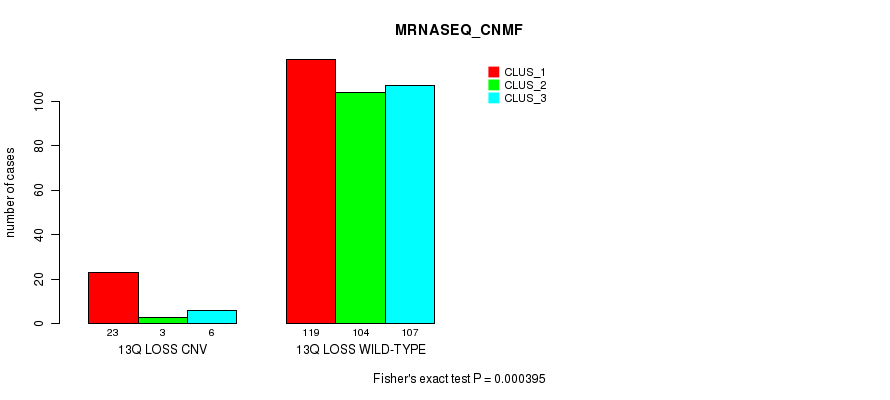 13q loss cnv correlated to 'CN_CNMF', 'METHLYATION_CNMF', 'MRNASEQ_CNMF', 'MRNASEQ_CHIERARCHICAL', 'MIRSEQ_CNMF', and 'MIRSEQ_CHIERARCHICAL'.