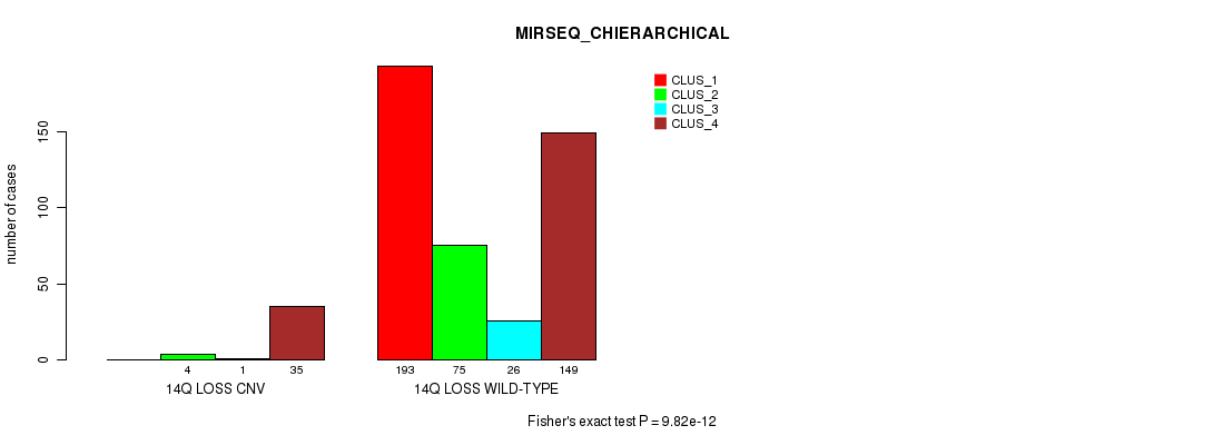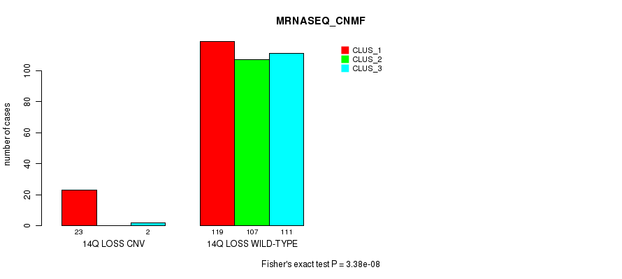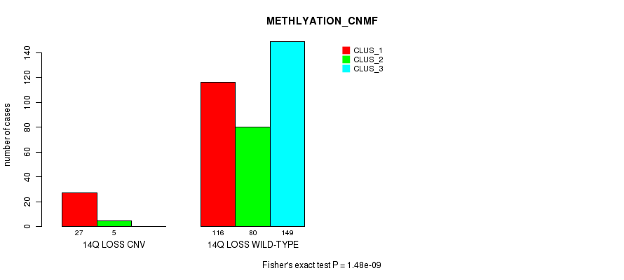 14q loss cnv correlated to 'CN_CNMF', 'METHLYATION_CNMF', 'MRNASEQ_CNMF', 'MRNASEQ_CHIERARCHICAL', 'MIRSEQ_CNMF', and 'MIRSEQ_CHIERARCHICAL'.