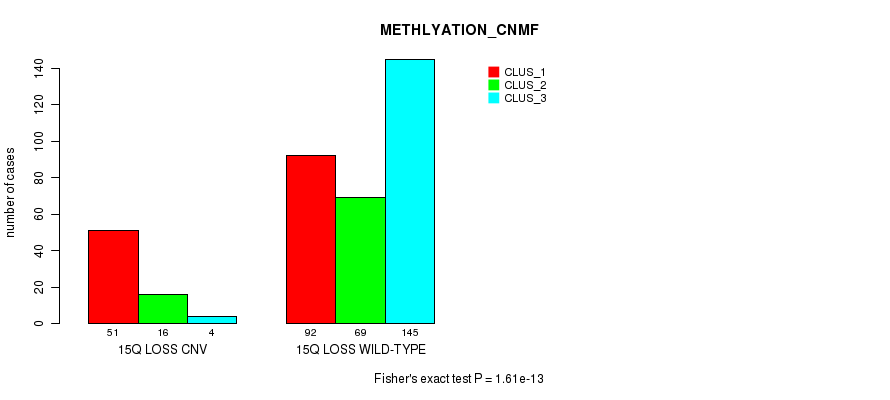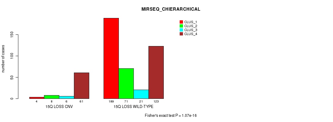 15q loss cnv correlated to 'CN_CNMF', 'METHLYATION_CNMF', 'MRNASEQ_CNMF', 'MRNASEQ_CHIERARCHICAL', 'MIRSEQ_CNMF', and 'MIRSEQ_CHIERARCHICAL'.