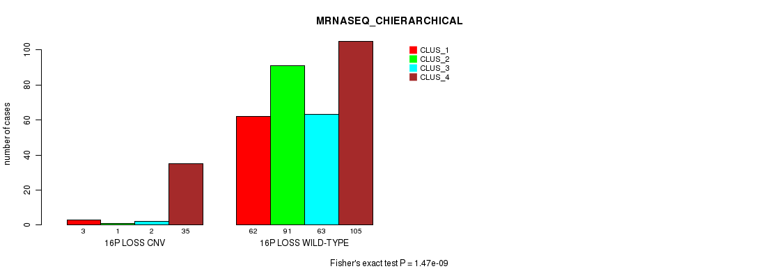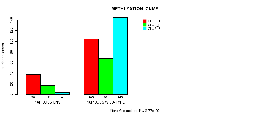 16p loss cnv correlated to 'CN_CNMF', 'METHLYATION_CNMF', 'MRNASEQ_CNMF', 'MRNASEQ_CHIERARCHICAL', 'MIRSEQ_CNMF', and 'MIRSEQ_CHIERARCHICAL'.