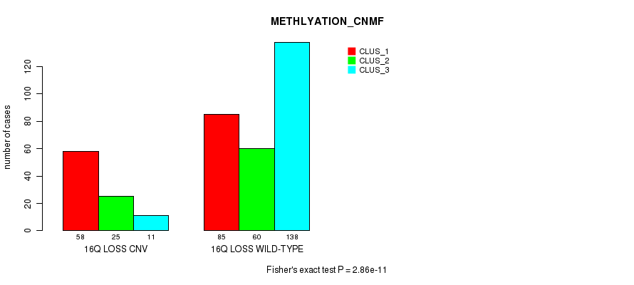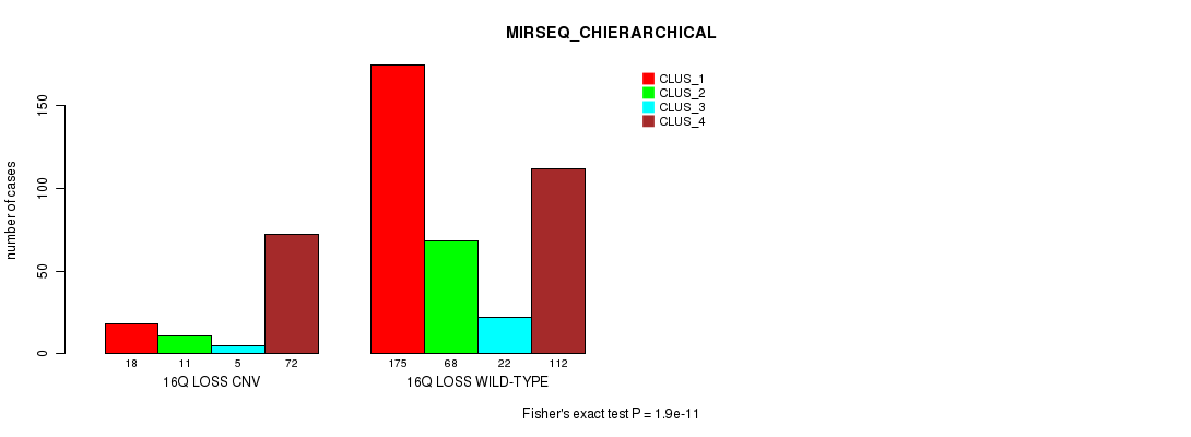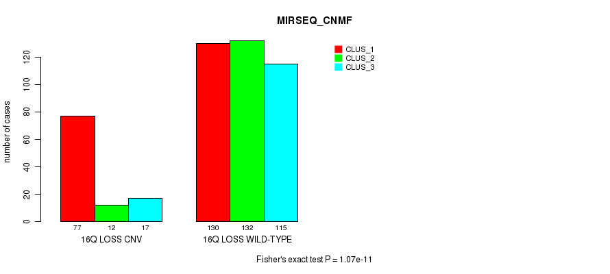 16q loss cnv correlated to 'CN_CNMF', 'METHLYATION_CNMF', 'MRNASEQ_CNMF', 'MRNASEQ_CHIERARCHICAL', 'MIRSEQ_CNMF', and 'MIRSEQ_CHIERARCHICAL'.