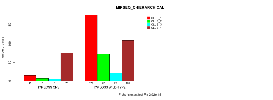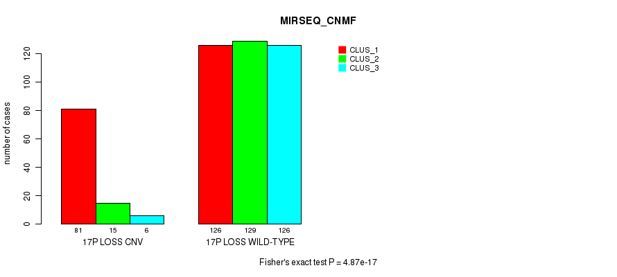 17p loss cnv correlated to 'CN_CNMF', 'METHLYATION_CNMF', 'MRNASEQ_CNMF', 'MRNASEQ_CHIERARCHICAL', 'MIRSEQ_CNMF', and 'MIRSEQ_CHIERARCHICAL'.