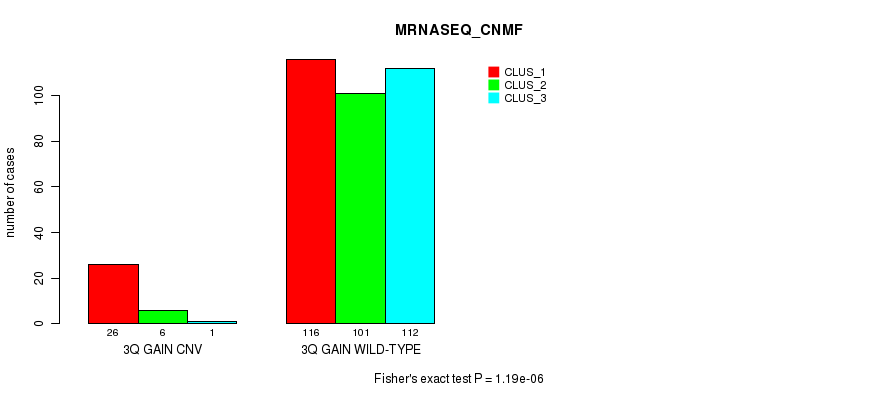 3q gain cnv correlated to 'CN_CNMF', 'METHLYATION_CNMF', 'MRNASEQ_CNMF', 'MRNASEQ_CHIERARCHICAL', 'MIRSEQ_CNMF', and 'MIRSEQ_CHIERARCHICAL'.