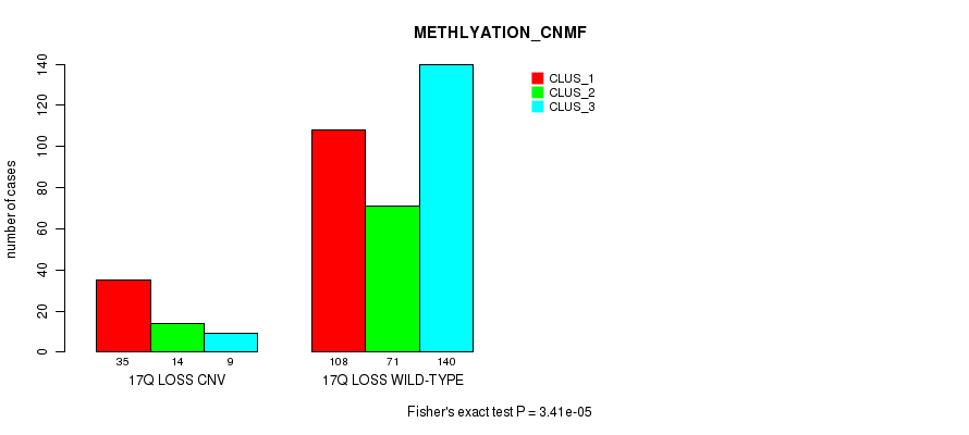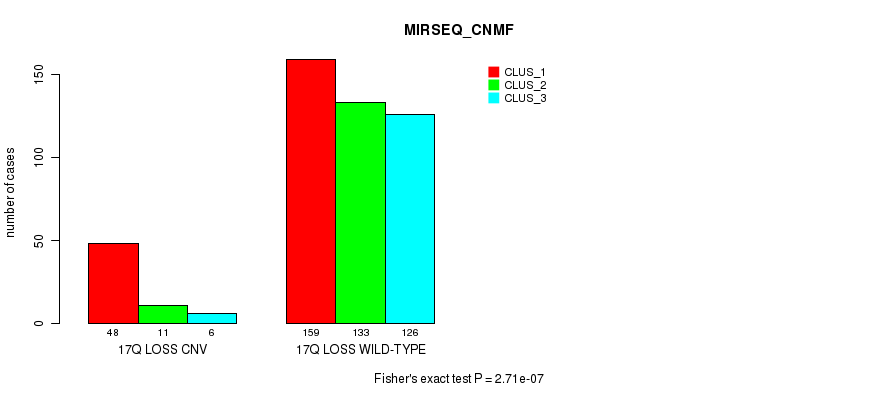 17q loss cnv correlated to 'CN_CNMF', 'METHLYATION_CNMF', 'MRNASEQ_CNMF', 'MRNASEQ_CHIERARCHICAL', 'MIRSEQ_CNMF', and 'MIRSEQ_CHIERARCHICAL'.