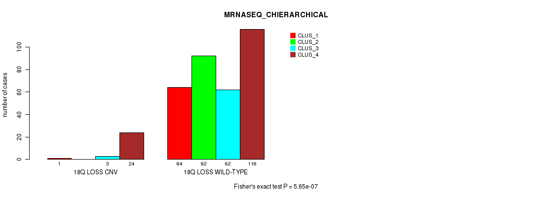 18q loss cnv correlated to 'CN_CNMF', 'METHLYATION_CNMF', 'MRNASEQ_CNMF', 'MRNASEQ_CHIERARCHICAL', 'MIRSEQ_CNMF', and 'MIRSEQ_CHIERARCHICAL'.