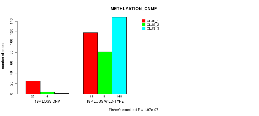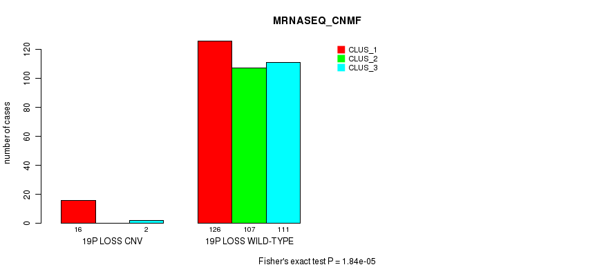 19p loss cnv correlated to 'CN_CNMF', 'METHLYATION_CNMF', 'MRNASEQ_CNMF', 'MRNASEQ_CHIERARCHICAL', 'MIRSEQ_CNMF', and 'MIRSEQ_CHIERARCHICAL'.