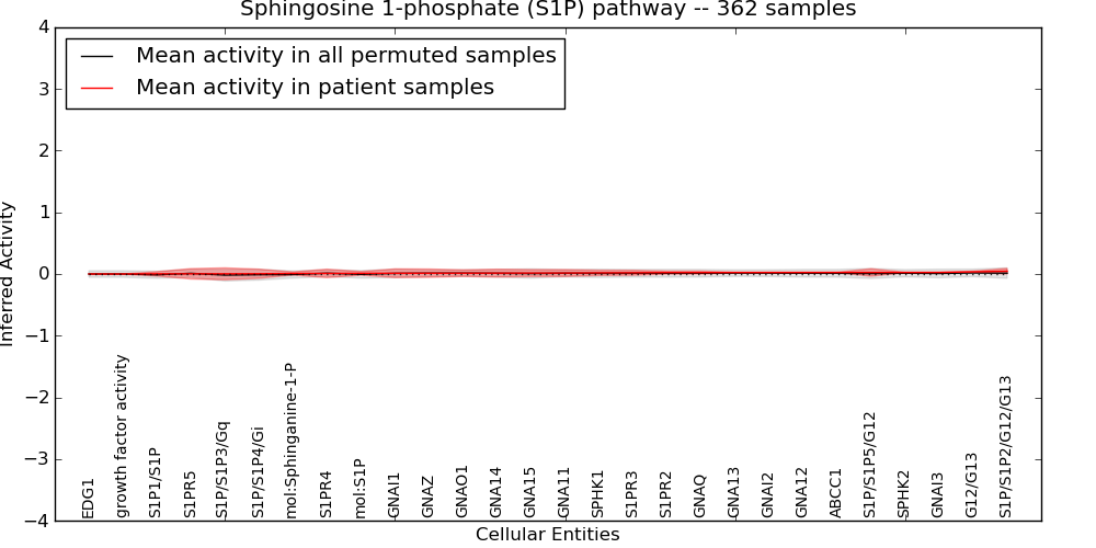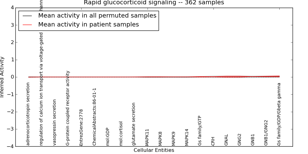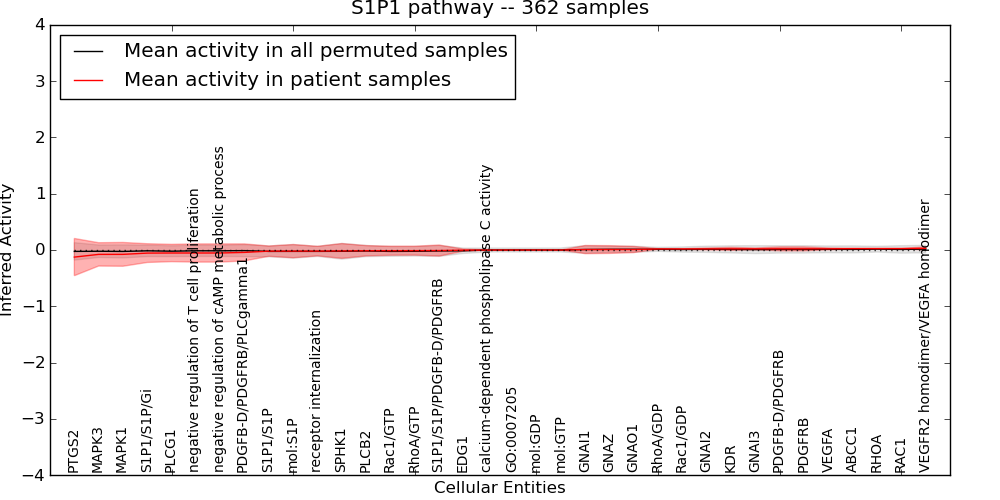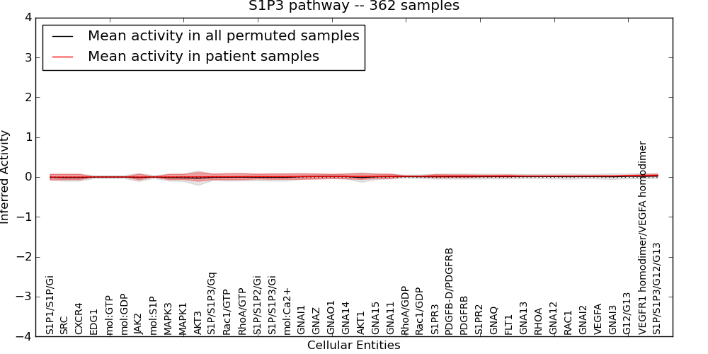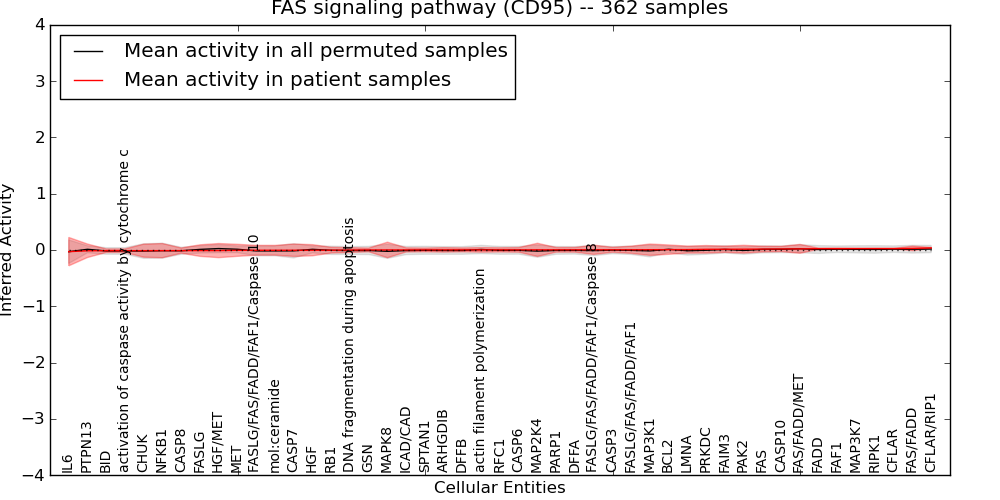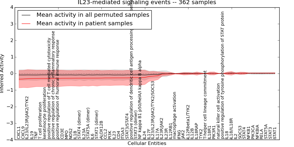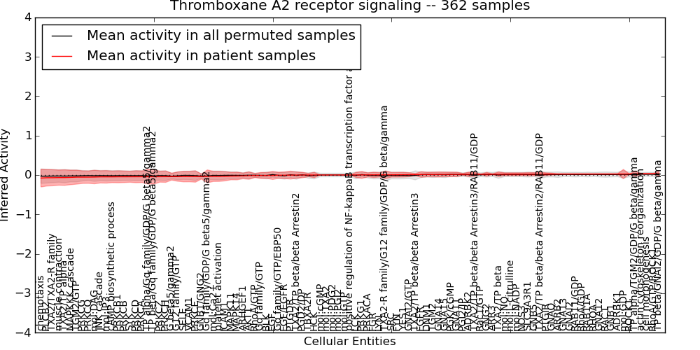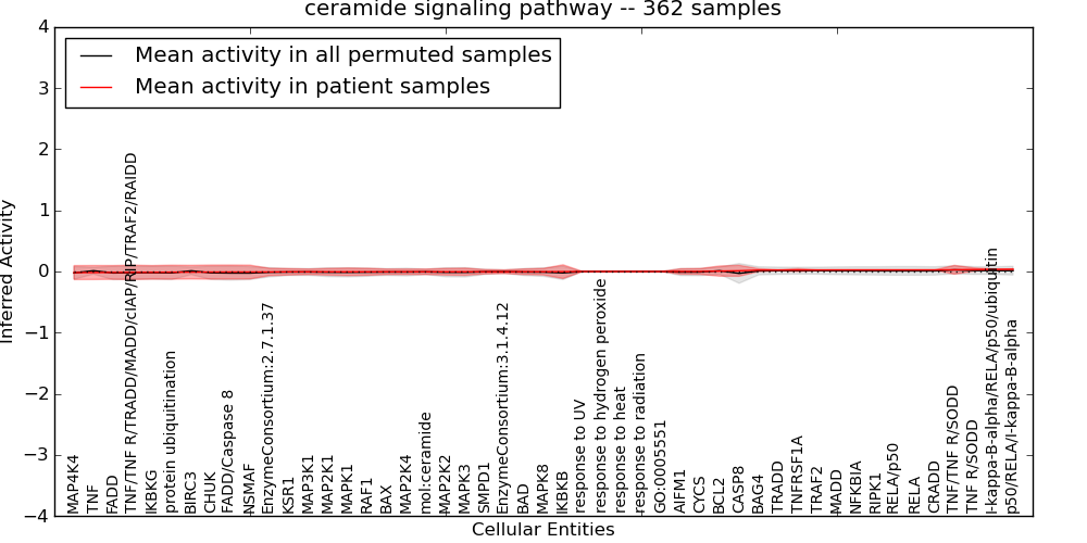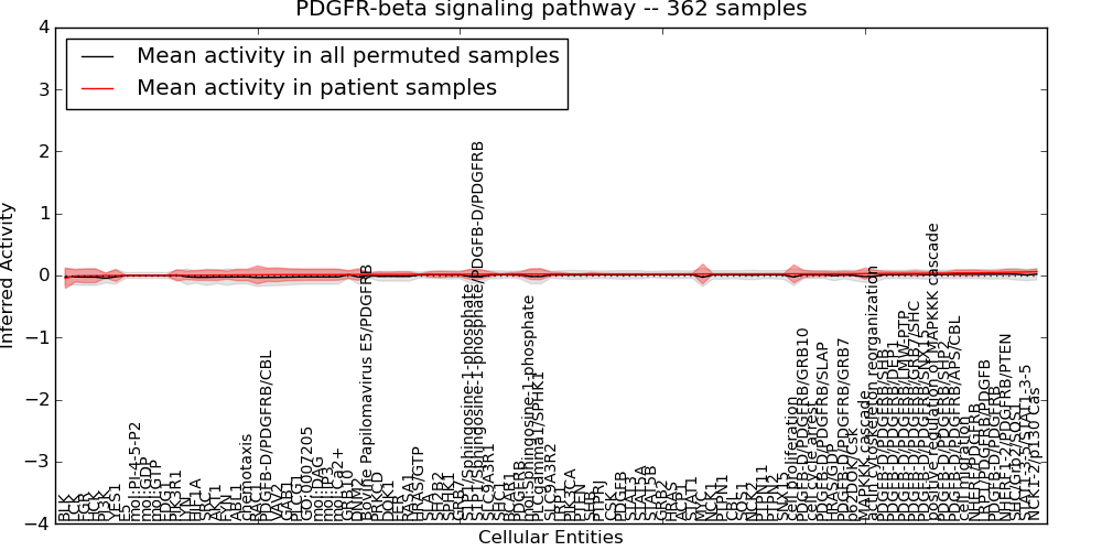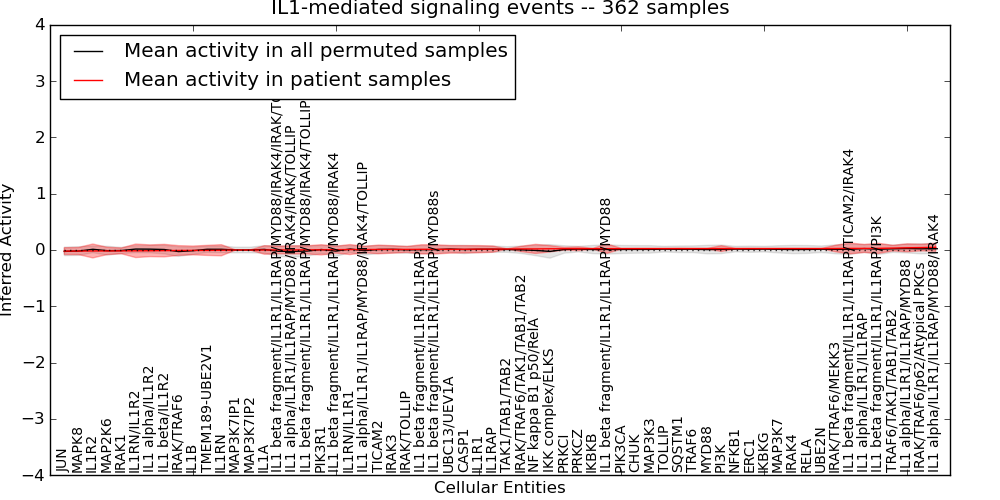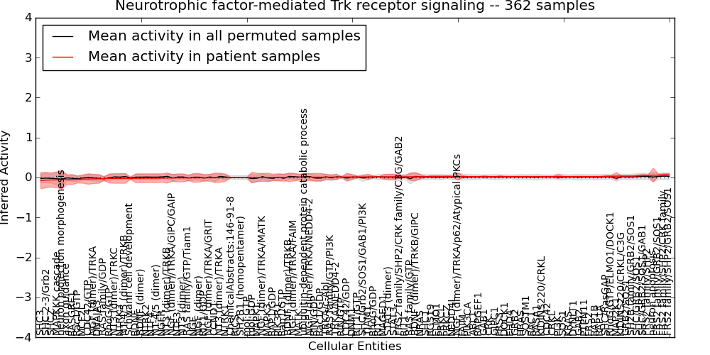 Figure S128. Get High-res Image This plot shows pathway concept perturbations across all samples against a permutation model. The concepts along the x-axis are sorted by lowest to highest mean activity for the real patient samples. Mean inferred activities are plotted along the y-axis as a colored band showing the average level and one standard deviation range. Real samples are shown in red and permuted samples in black.