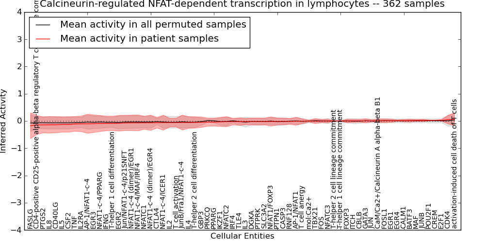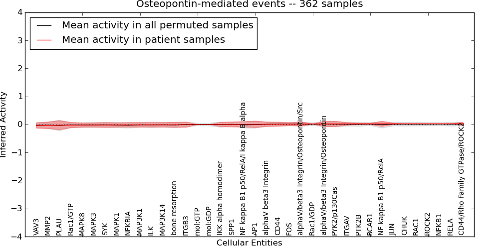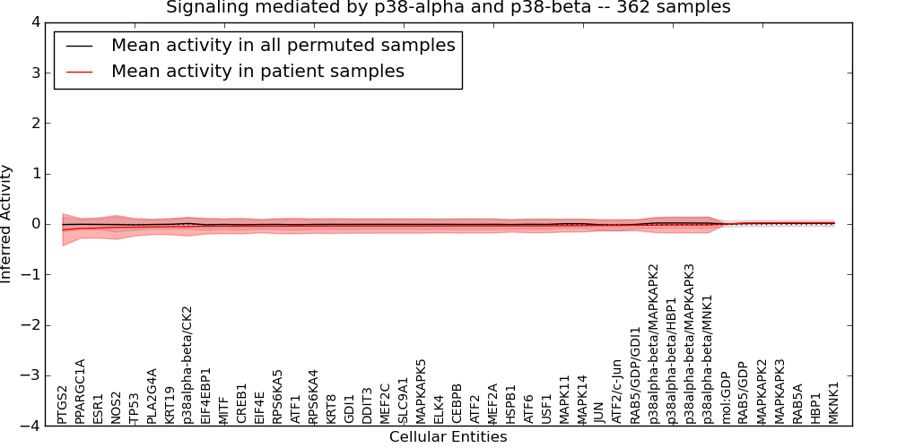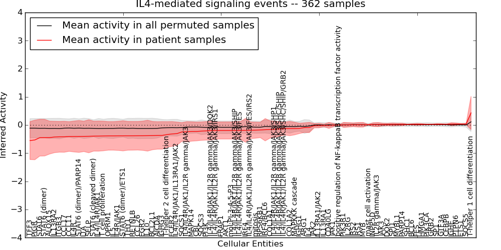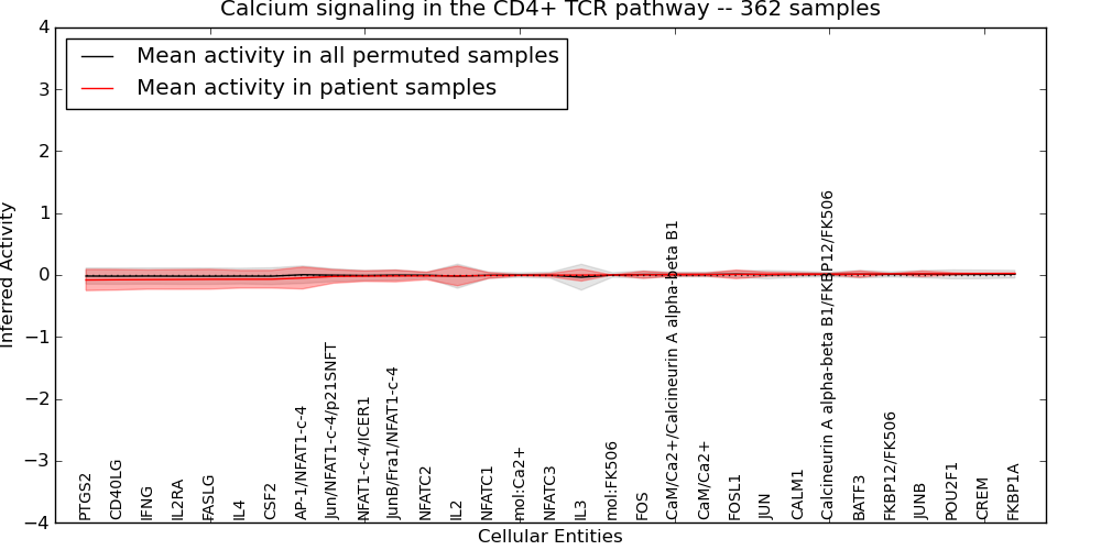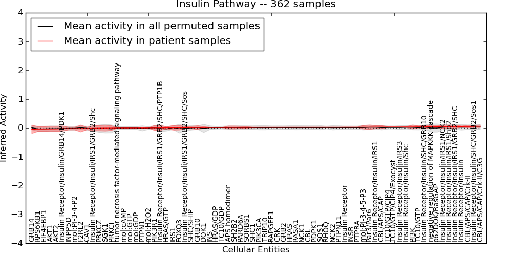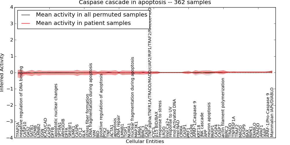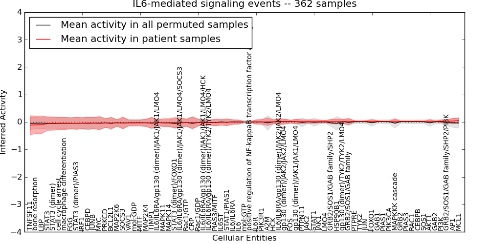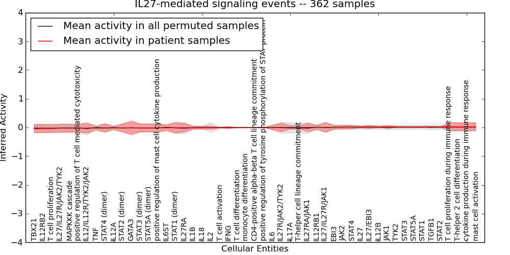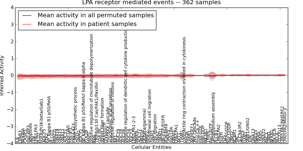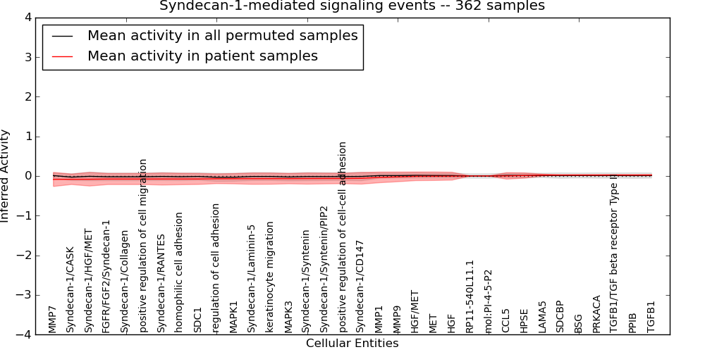 Figure S128. Get High-res Image This plot shows pathway concept perturbations across all samples against a permutation model. The concepts along the x-axis are sorted by lowest to highest mean activity for the real patient samples. Mean inferred activities are plotted along the y-axis as a colored band showing the average level and one standard deviation range. Real samples are shown in red and permuted samples in black.