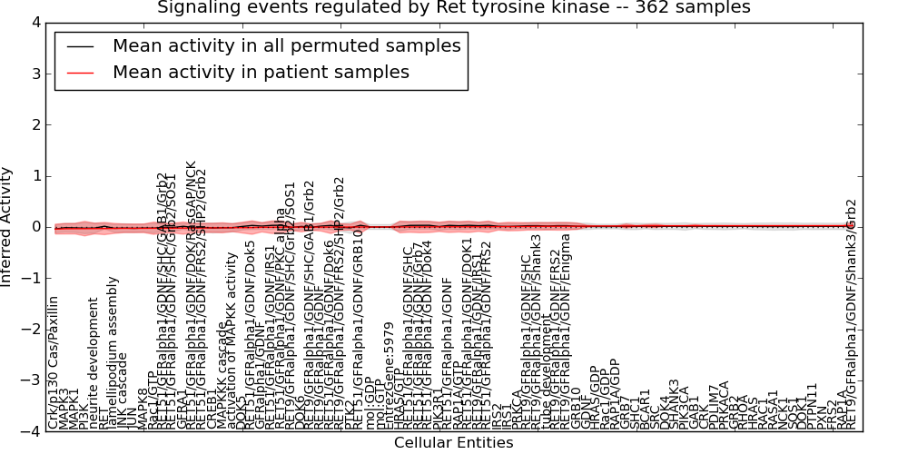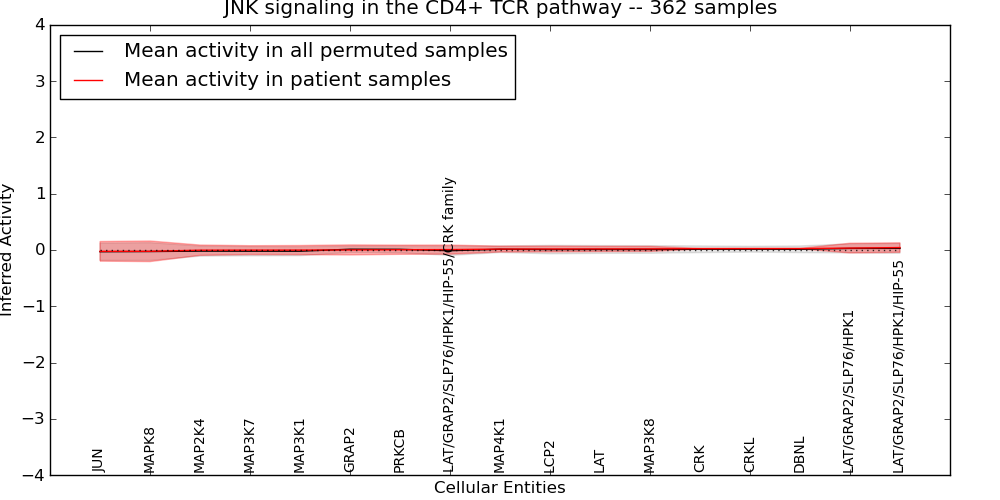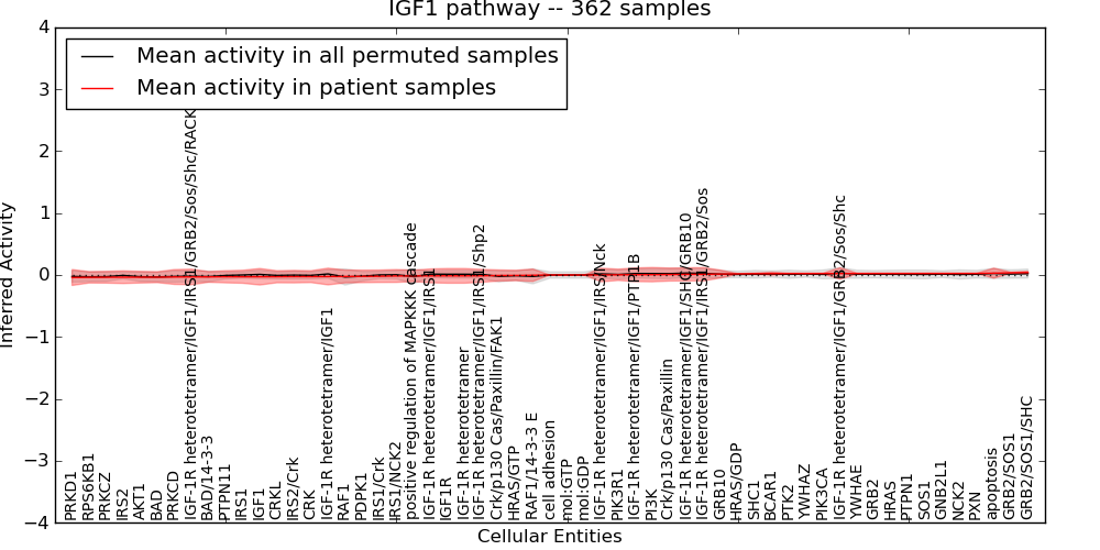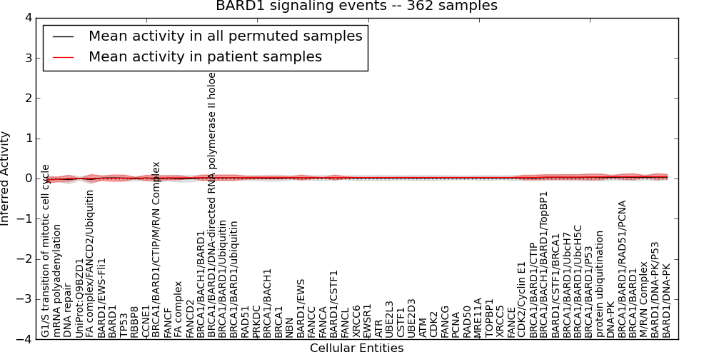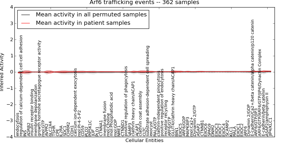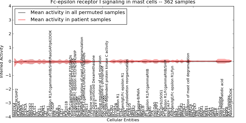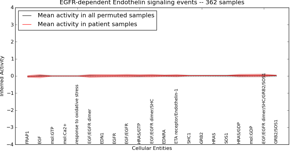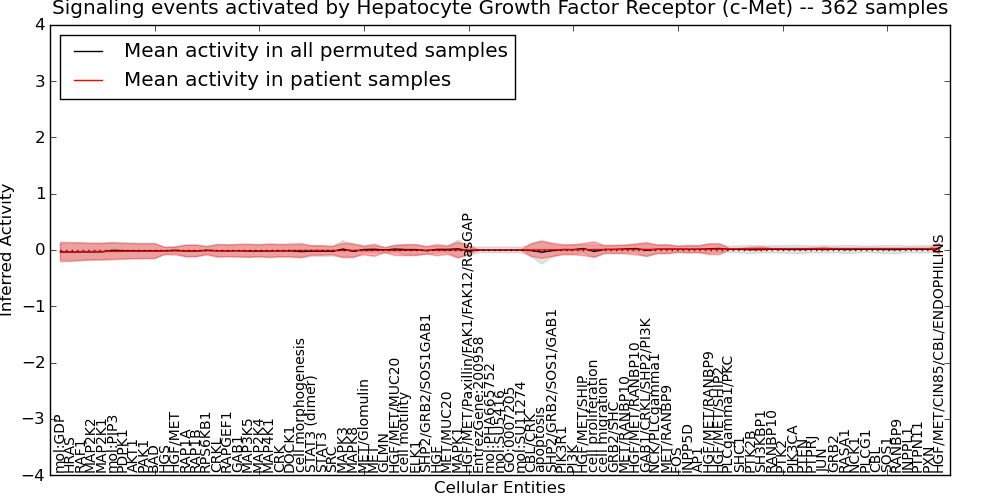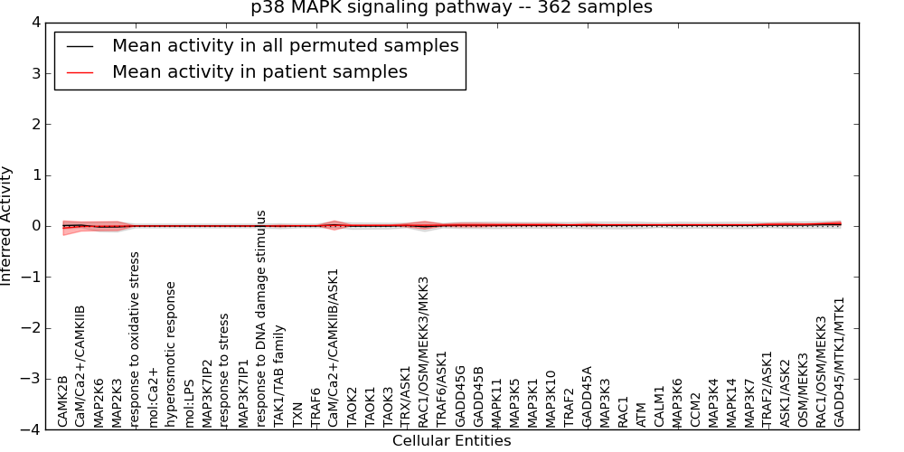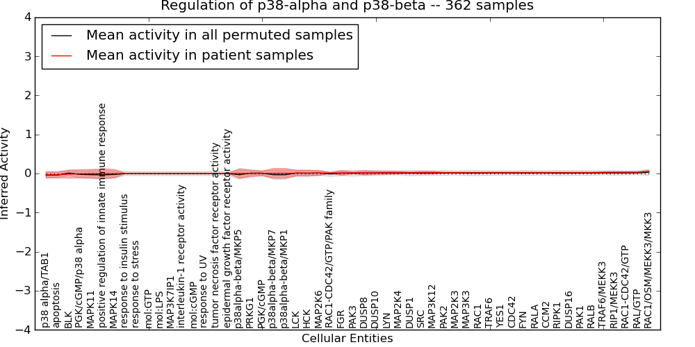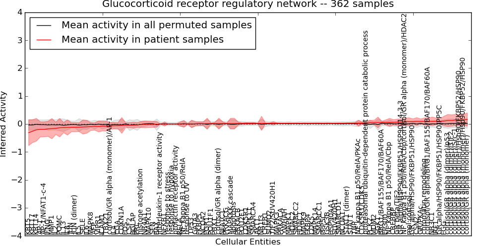 Figure S128. Get High-res Image This plot shows pathway concept perturbations across all samples against a permutation model. The concepts along the x-axis are sorted by lowest to highest mean activity for the real patient samples. Mean inferred activities are plotted along the y-axis as a colored band showing the average level and one standard deviation range. Real samples are shown in red and permuted samples in black.