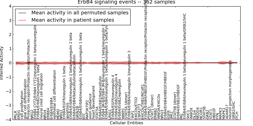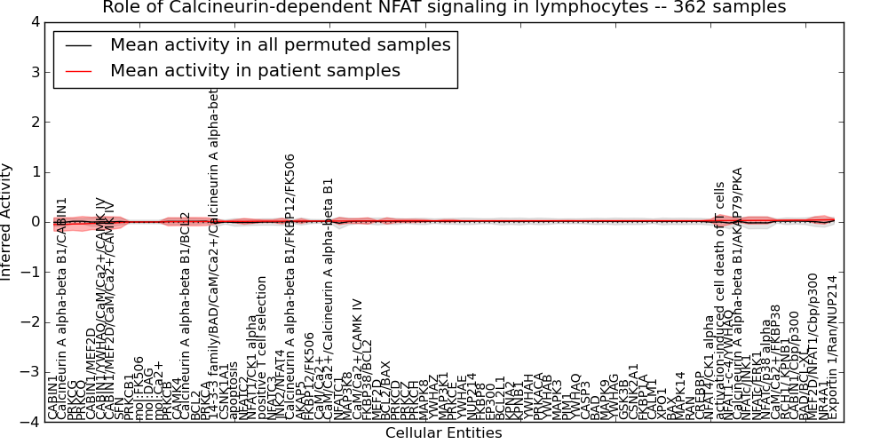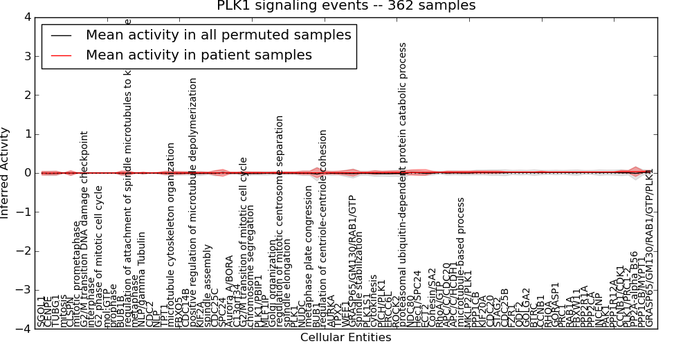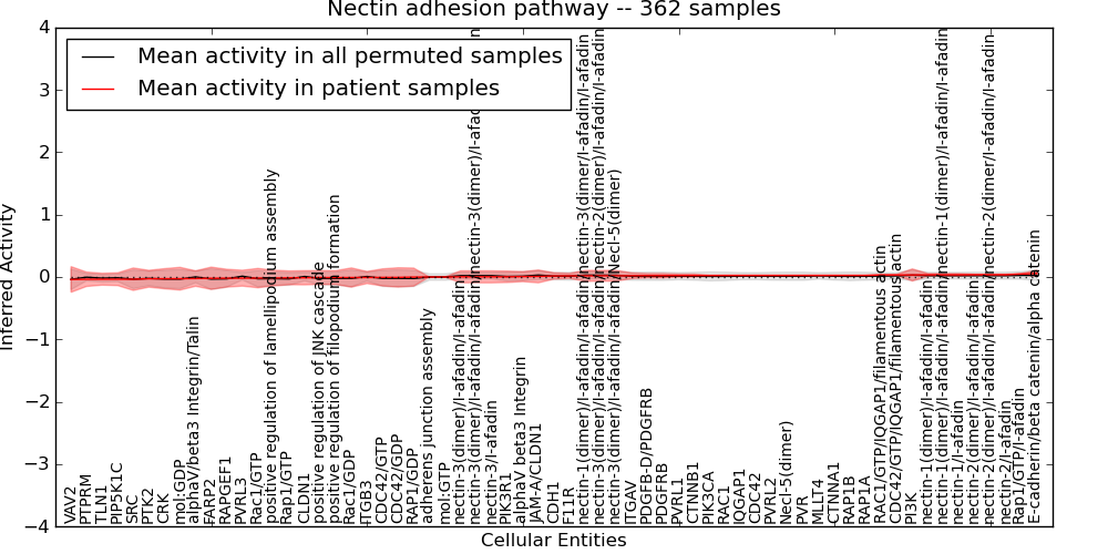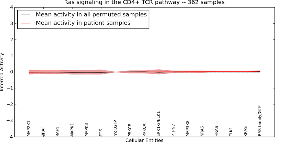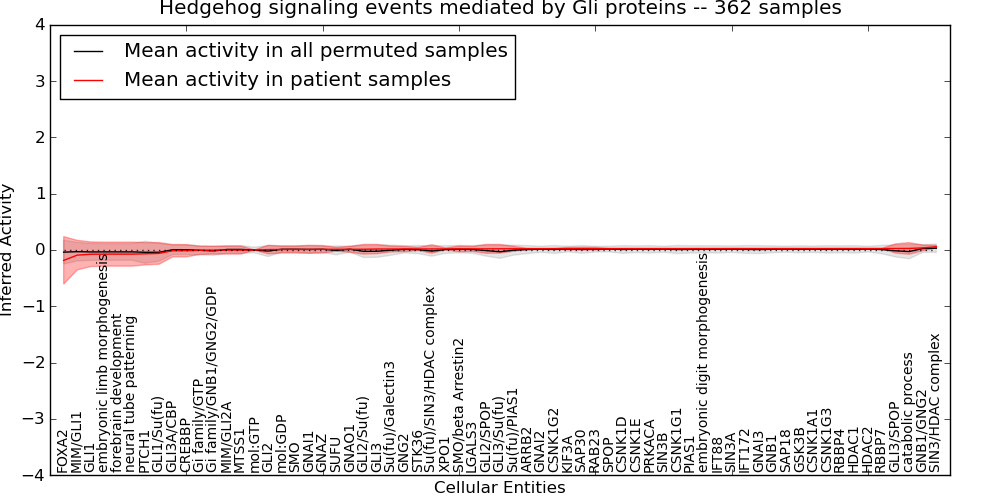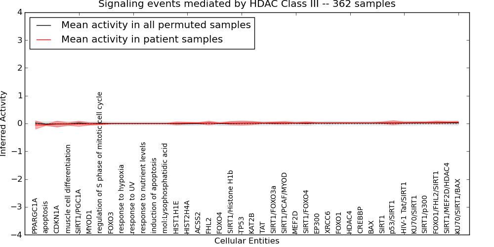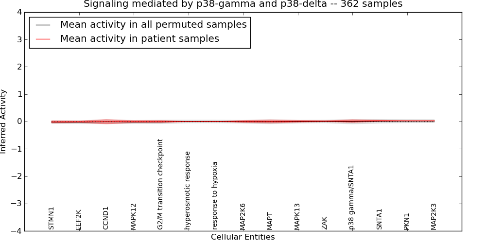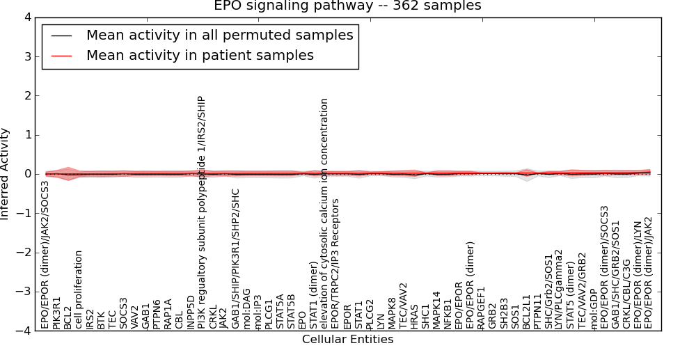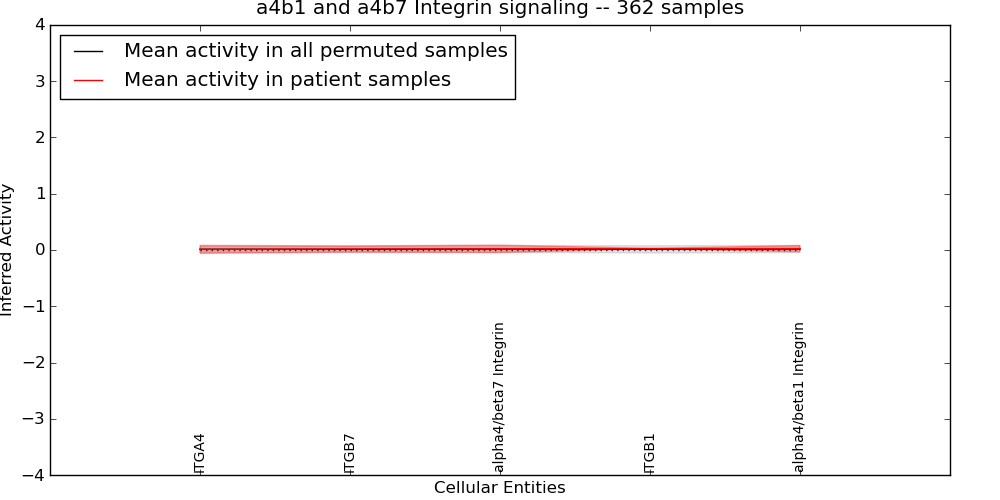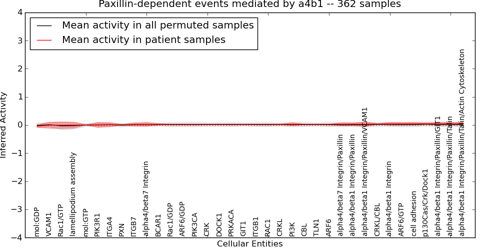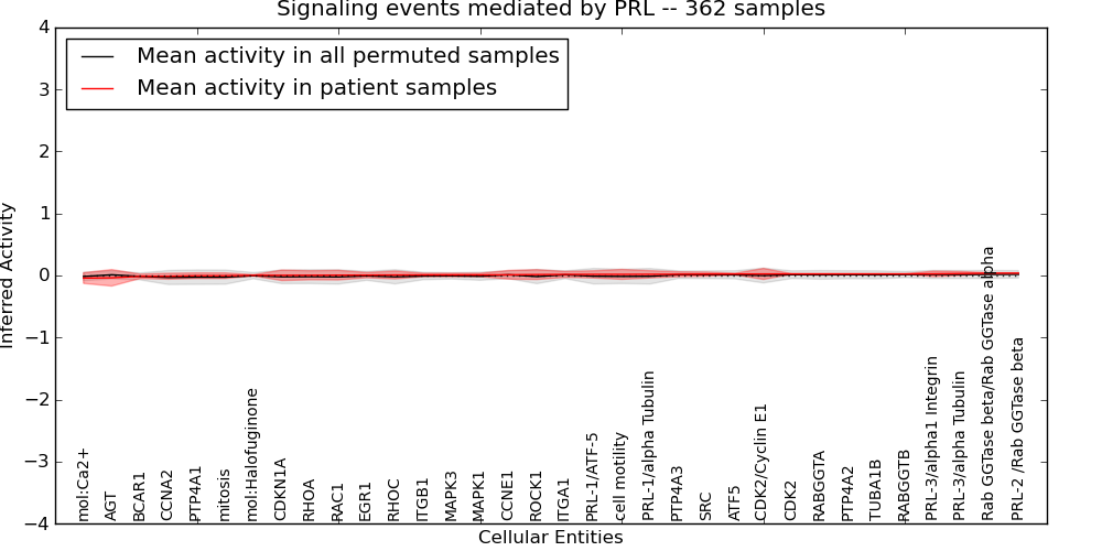 Figure S128. Get High-res Image This plot shows pathway concept perturbations across all samples against a permutation model. The concepts along the x-axis are sorted by lowest to highest mean activity for the real patient samples. Mean inferred activities are plotted along the y-axis as a colored band showing the average level and one standard deviation range. Real samples are shown in red and permuted samples in black.