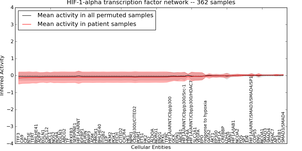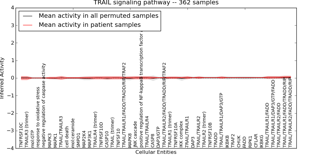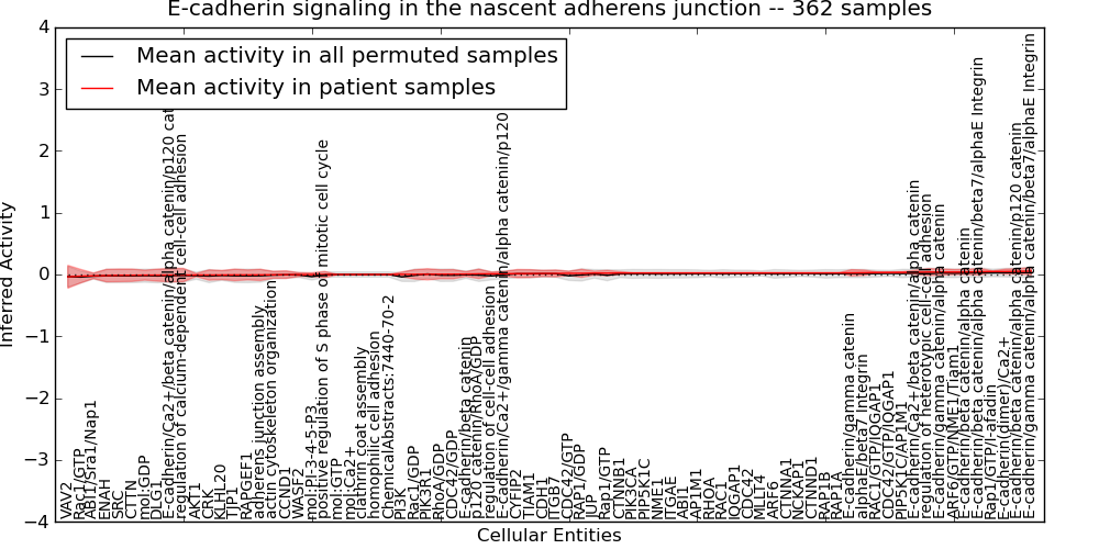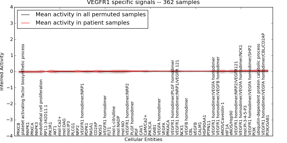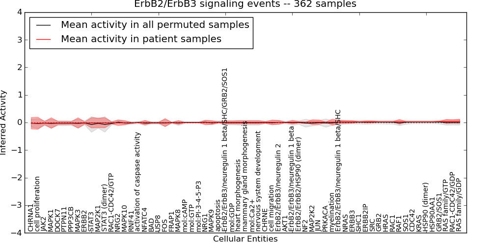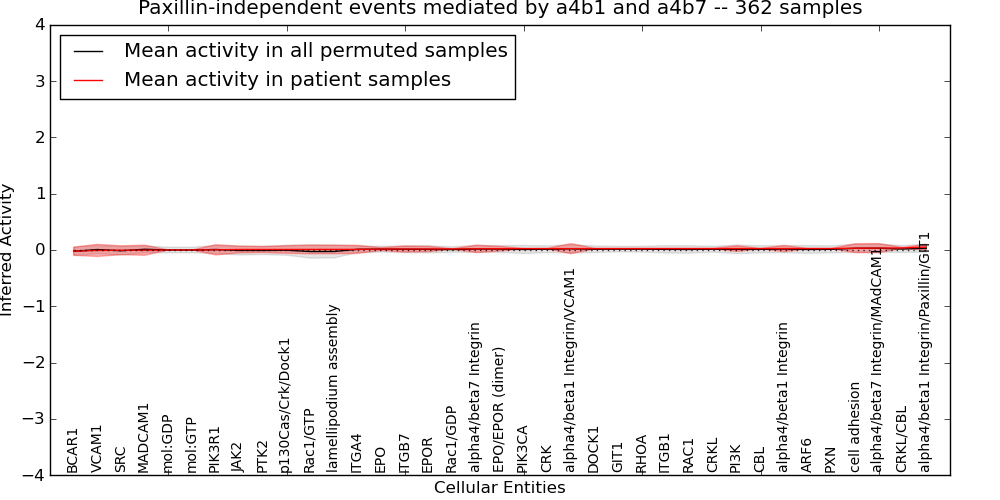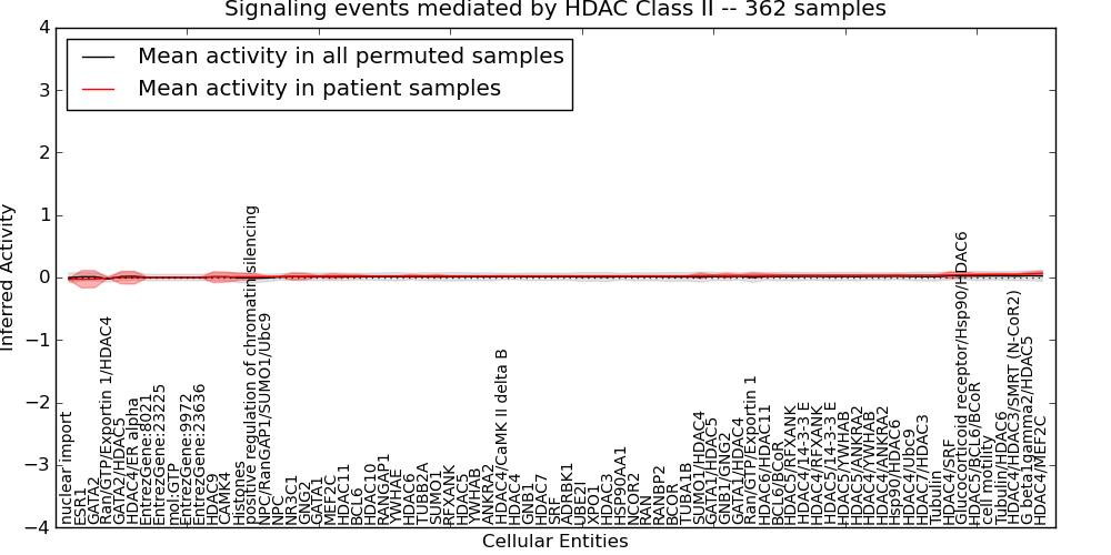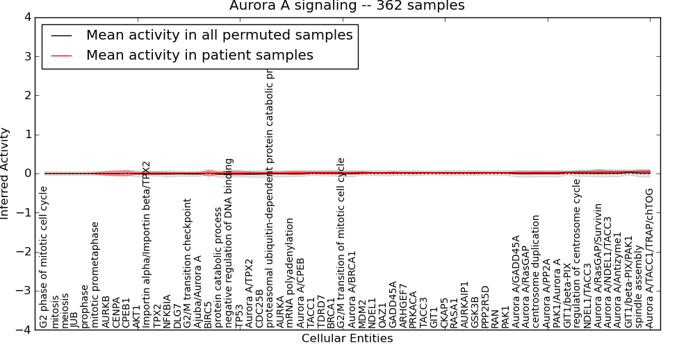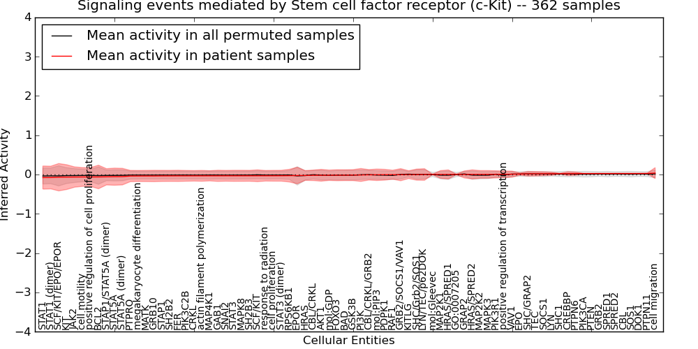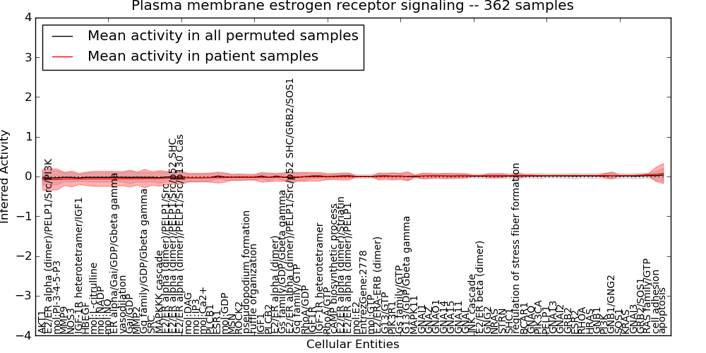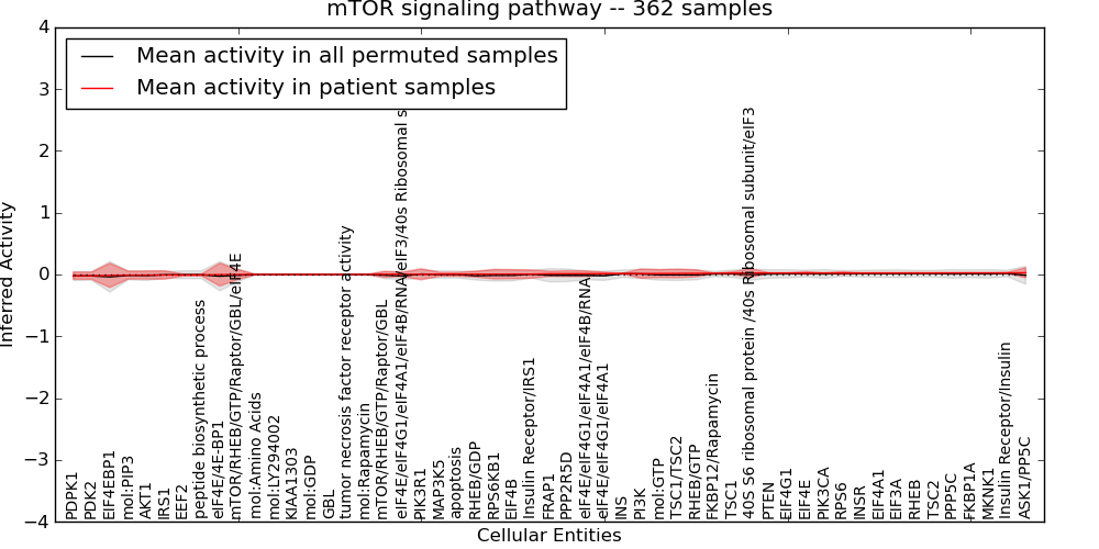Figure S128. Get High-res Image This plot shows pathway concept perturbations across all samples against a permutation model. The concepts along the x-axis are sorted by lowest to highest mean activity for the real patient samples. Mean inferred activities are plotted along the y-axis as a colored band showing the average level and one standard deviation range. Real samples are shown in red and permuted samples in black.