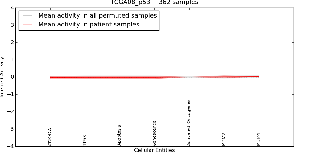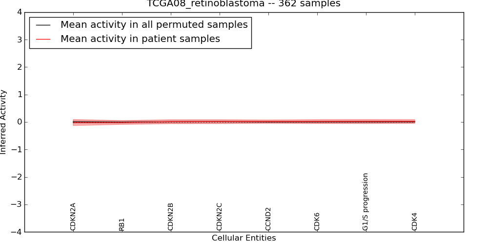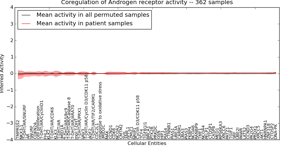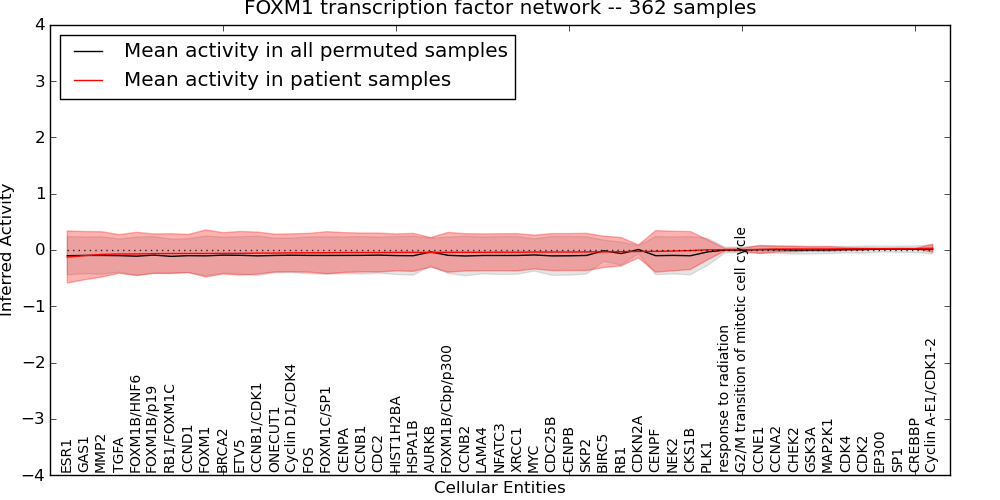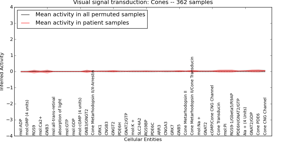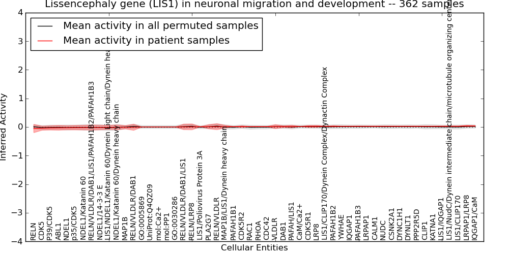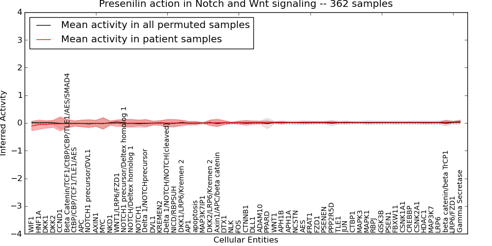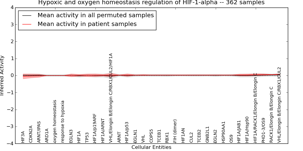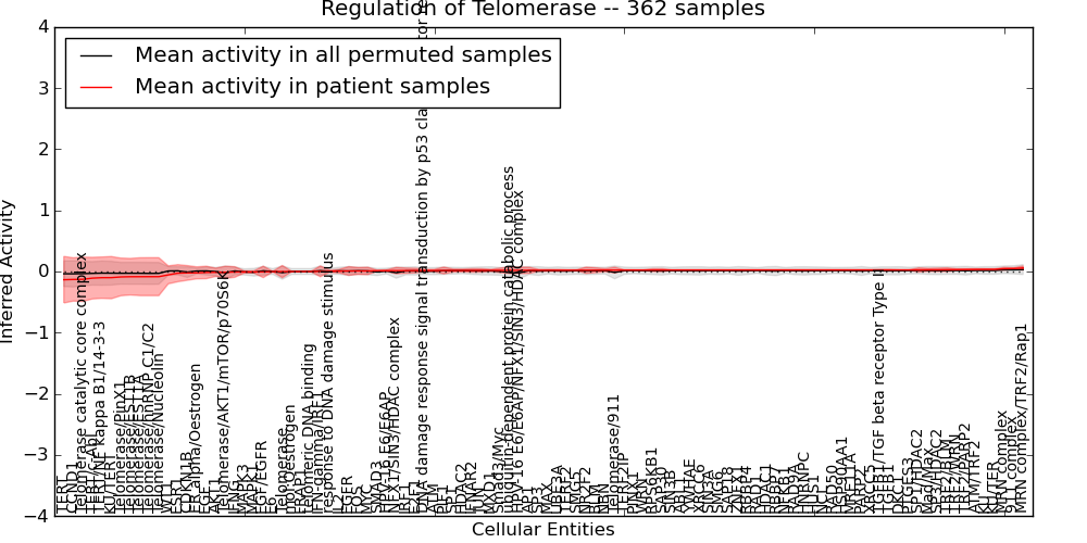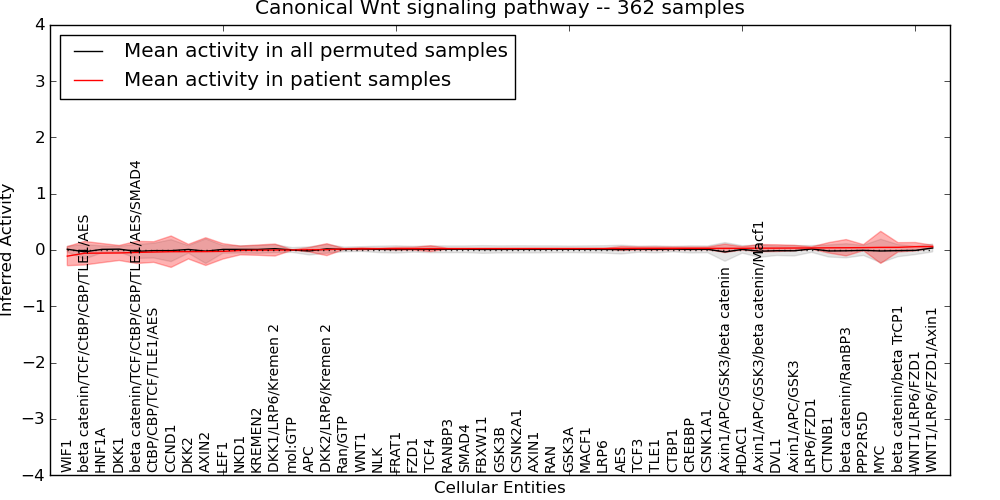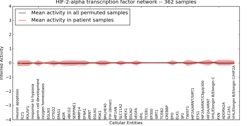 Figure S128. Get High-res Image This plot shows pathway concept perturbations across all samples against a permutation model. The concepts along the x-axis are sorted by lowest to highest mean activity for the real patient samples. Mean inferred activities are plotted along the y-axis as a colored band showing the average level and one standard deviation range. Real samples are shown in red and permuted samples in black.