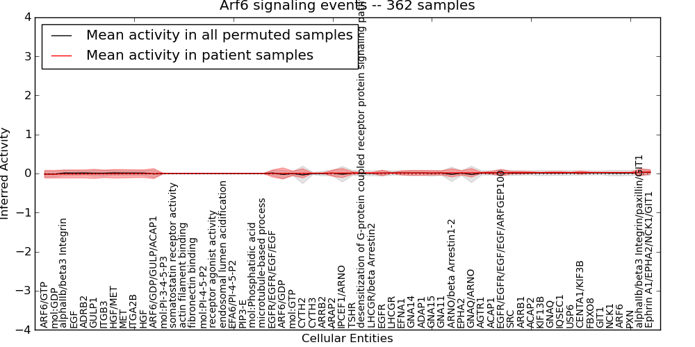 Figure S130. Get High-res Image This plot shows pathway concept perturbations across all samples against a permutation model. The concepts along the x-axis are sorted by lowest to highest mean activity for the real patient samples. Mean inferred activities are plotted along the y-axis as a colored band showing the average level and one standard deviation range. Real samples are shown in red and permuted samples in black.