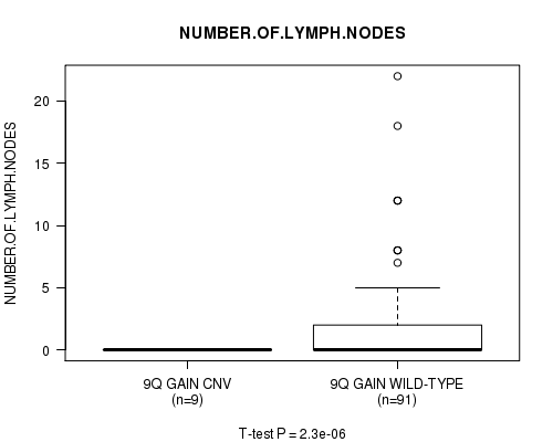 9q gain cnv correlated to 'NUMBER.OF.LYMPH.NODES'.