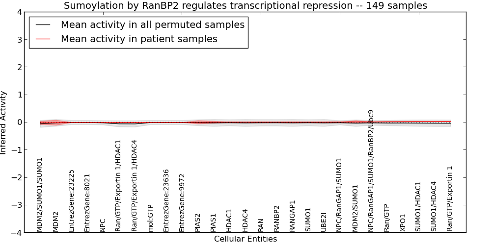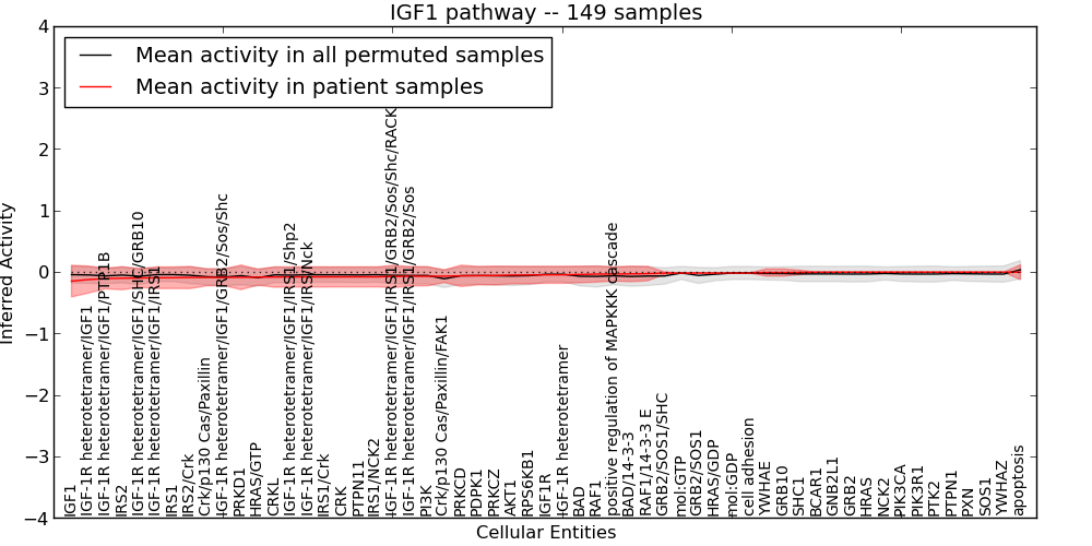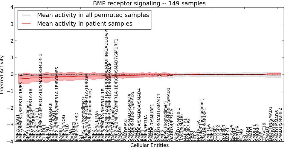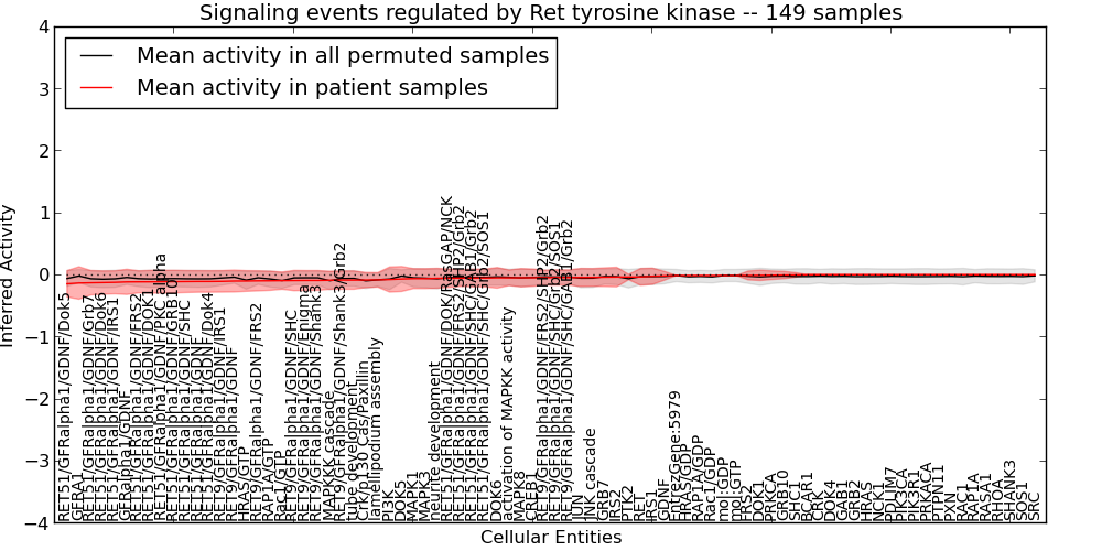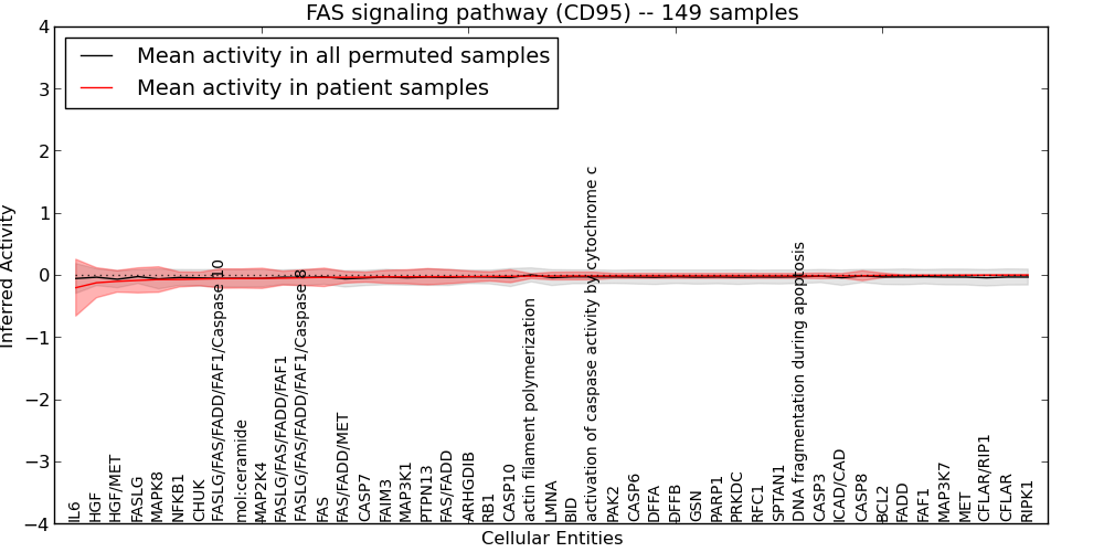 Figure S131. Get High-res Image This plot shows pathway concept perturbations across all samples against a permutation model. The concepts along the x-axis are sorted by lowest to highest mean activity for the real patient samples. Mean inferred activities are plotted along the y-axis as a colored band showing the average level and one standard deviation range. Real samples are shown in red and permuted samples in black.