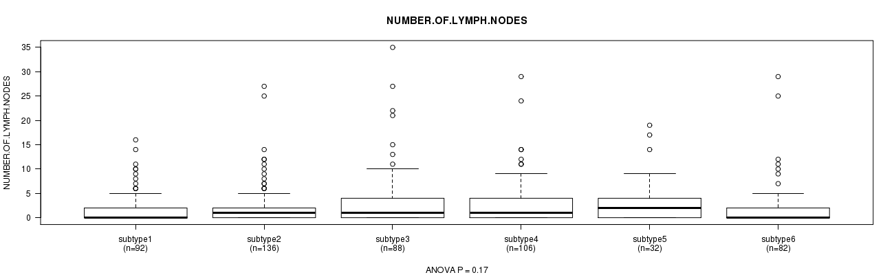 Table S119. Clustering Approach #12: 'MIRseq Mature cHierClus subtypes' versus Clinical Feature #8: 'NUMBER.OF.LYMPH.NODES'