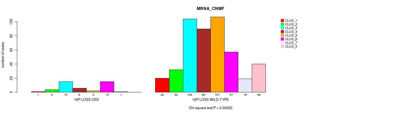 19p loss cnv correlated to 'MRNA_CNMF', 'MRNA_CHIERARCHICAL', 'CN_CNMF', 'METHLYATION_CNMF', 'MRNASEQ_CNMF', and 'MRNASEQ_CHIERARCHICAL'.