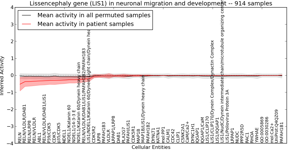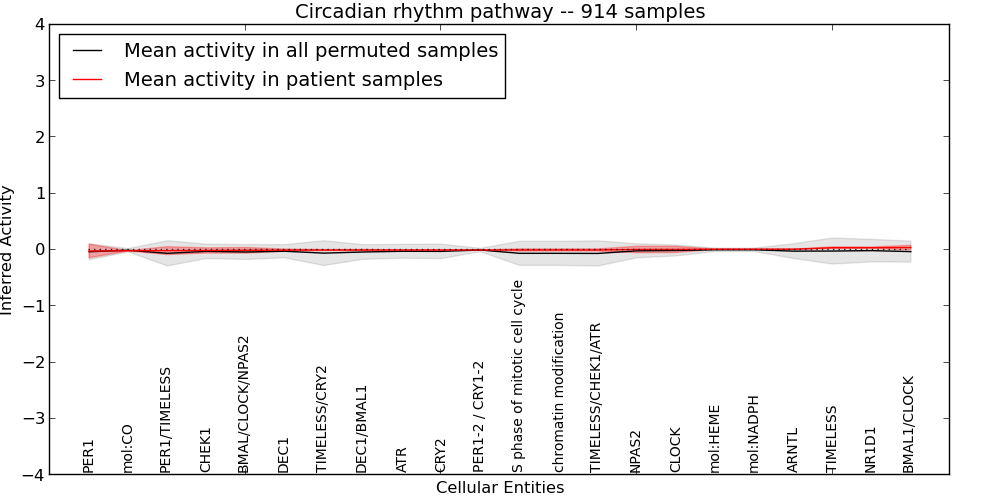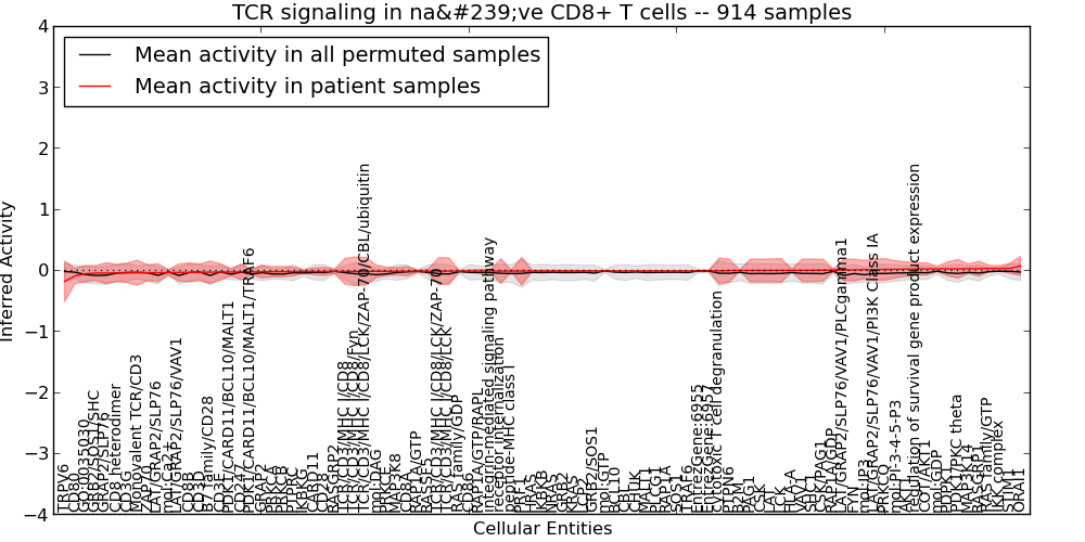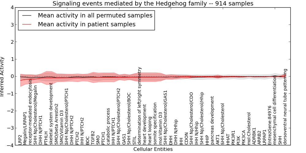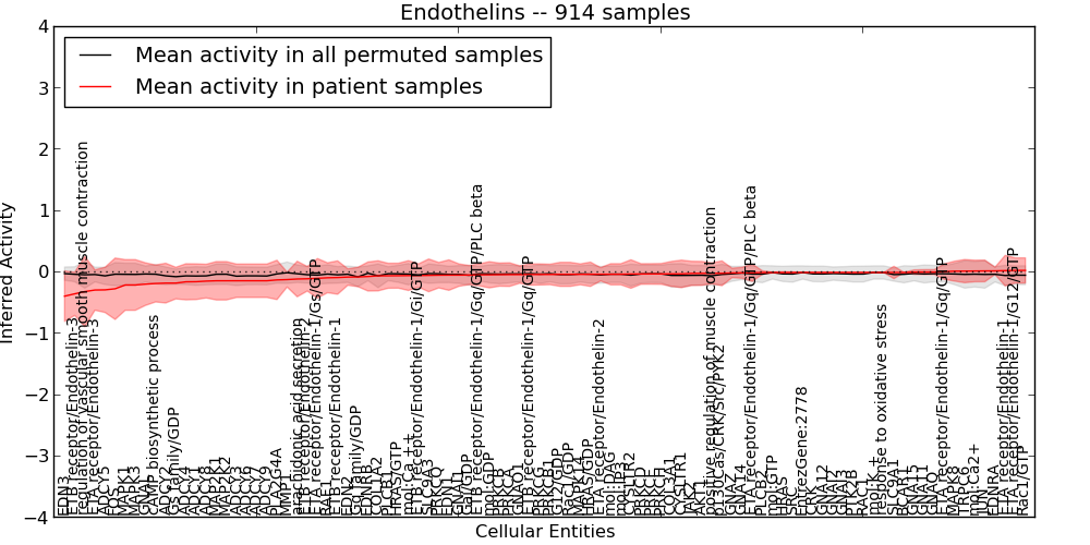 Figure S131. Get High-res Image This plot shows pathway concept perturbations across all samples against a permutation model. The concepts along the x-axis are sorted by lowest to highest mean activity for the real patient samples. Mean inferred activities are plotted along the y-axis as a colored band showing the average level and one standard deviation range. Real samples are shown in red and permuted samples in black.