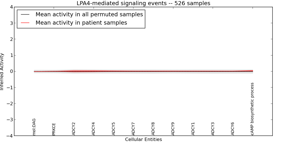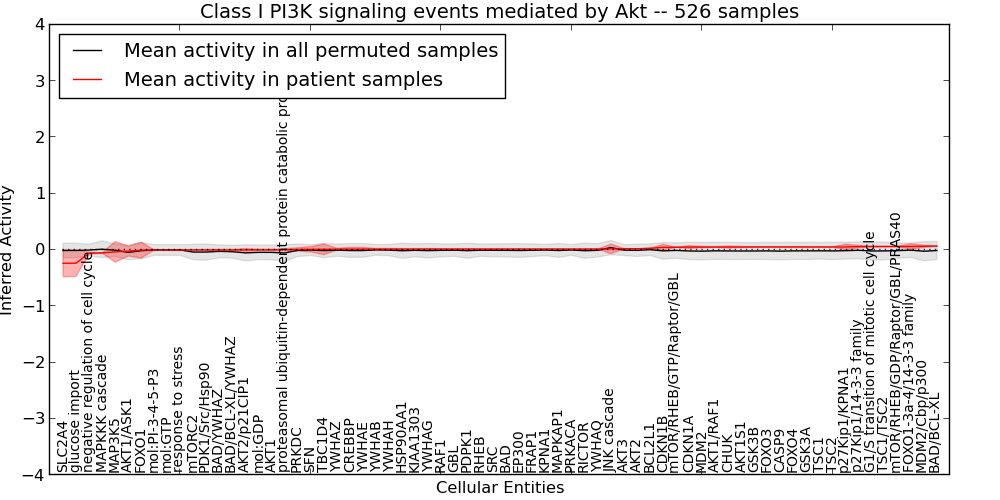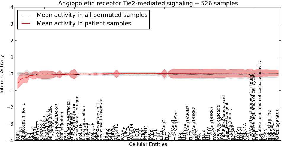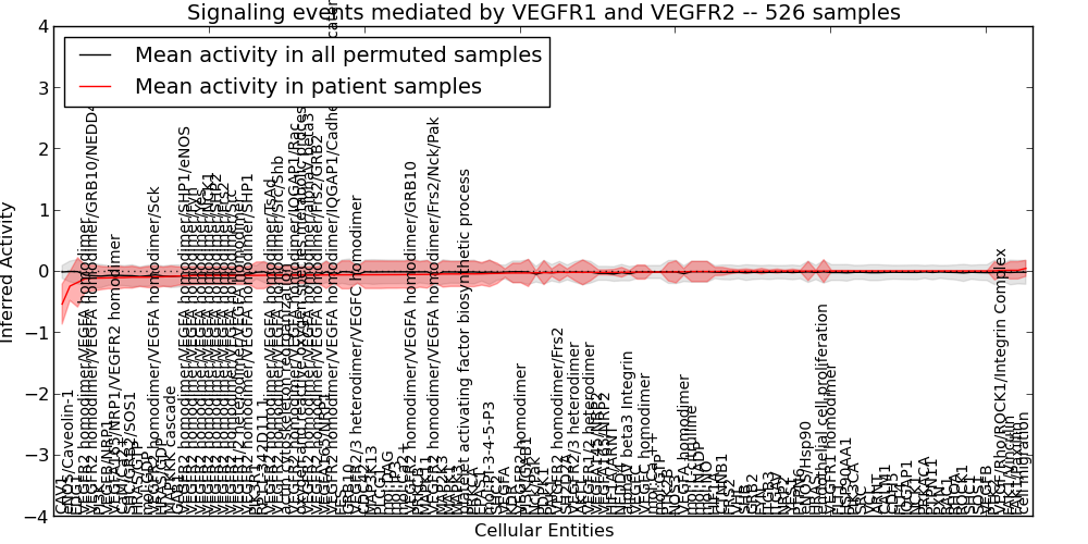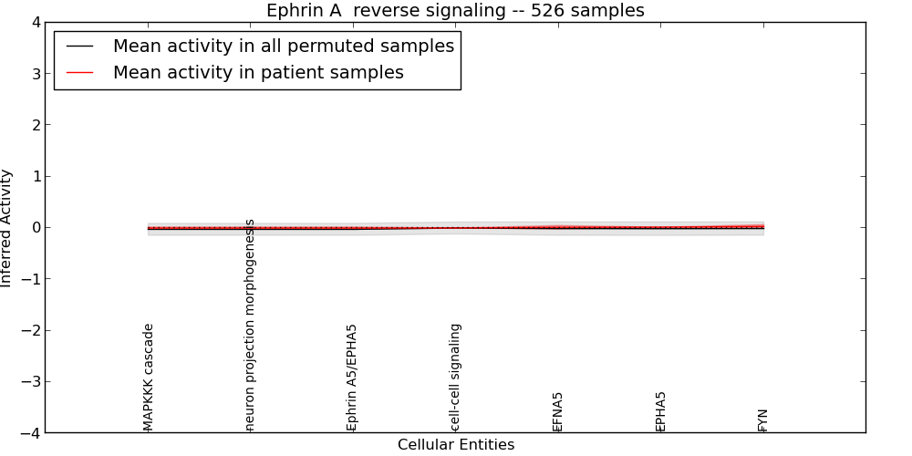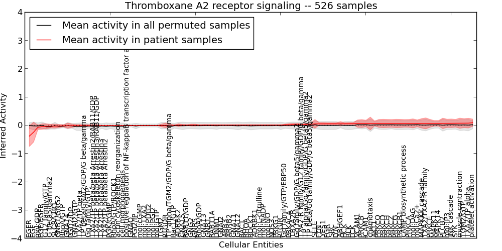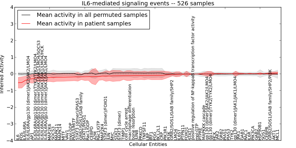 Figure S131.  Get High-res Image This plot shows pathway concept perturbations across all samples against a permutation model. The concepts along the x-axis are sorted by lowest to highest mean activity for the real patient samples. Mean inferred activities are plotted along the y-axis as a colored band showing the average level and one standard deviation range. Real samples are shown in red and permuted samples in black.