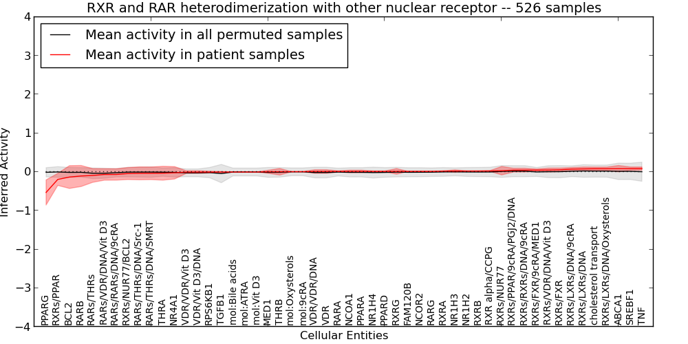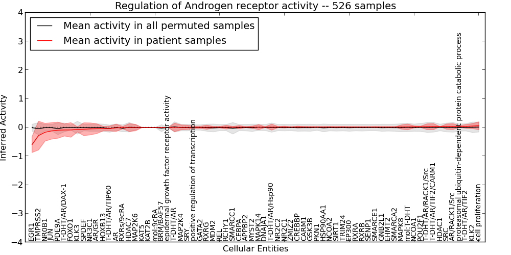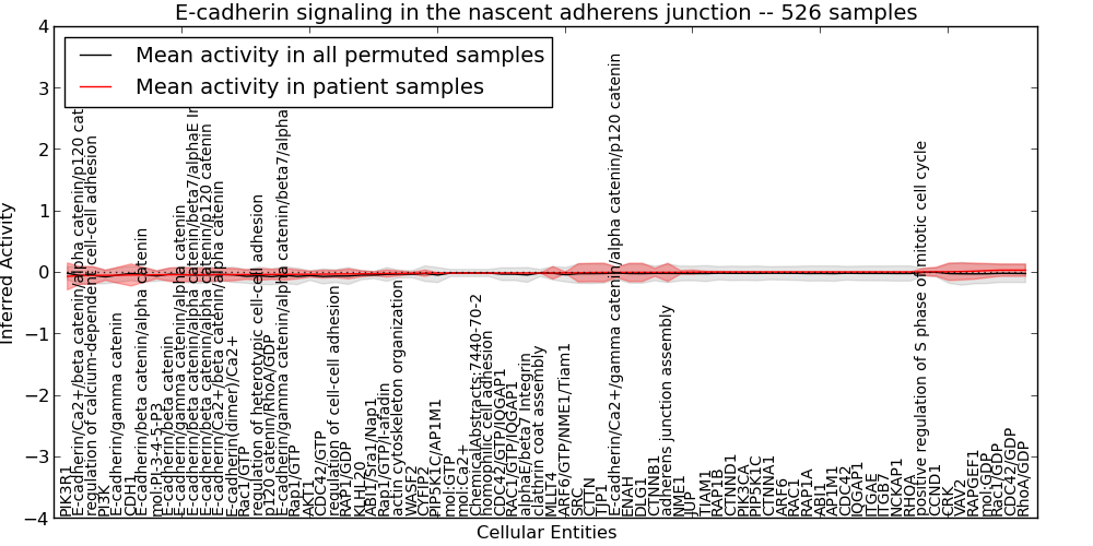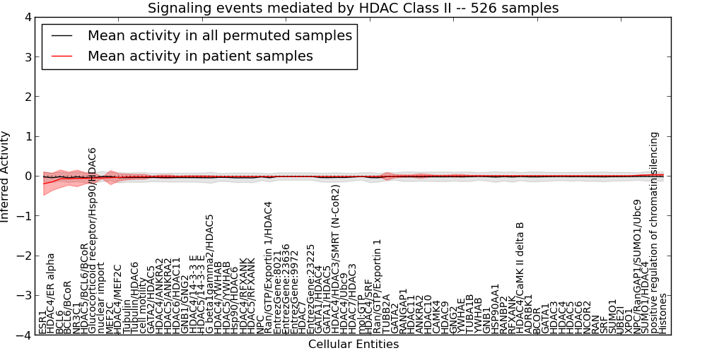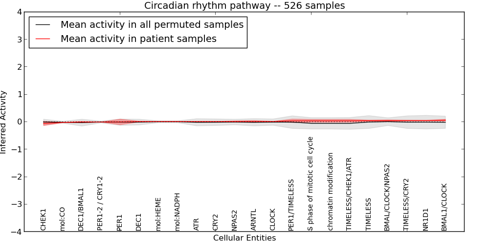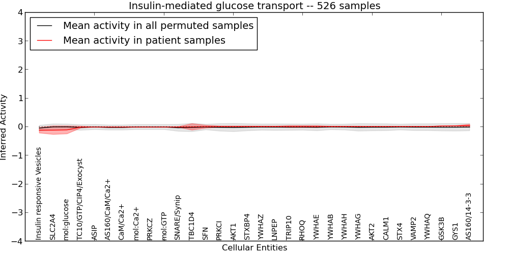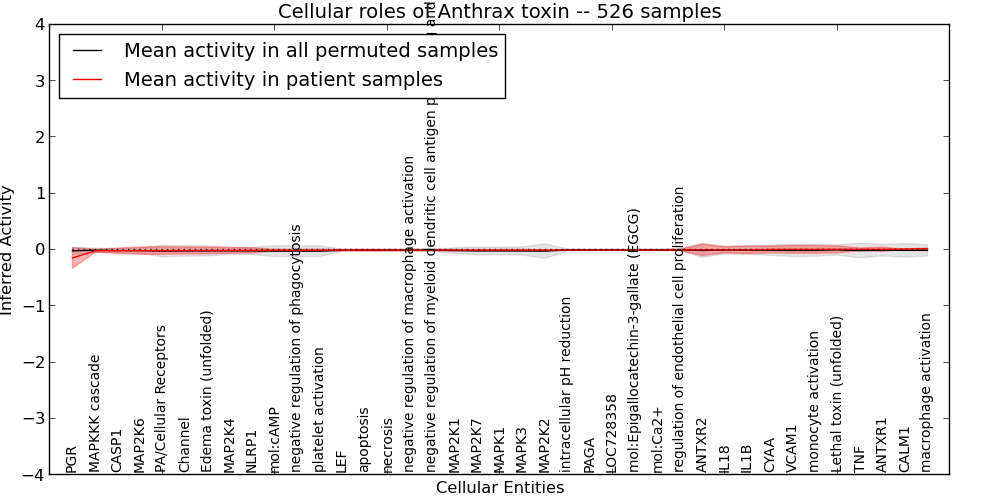 Figure S131.  Get High-res Image This plot shows pathway concept perturbations across all samples against a permutation model. The concepts along the x-axis are sorted by lowest to highest mean activity for the real patient samples. Mean inferred activities are plotted along the y-axis as a colored band showing the average level and one standard deviation range. Real samples are shown in red and permuted samples in black.