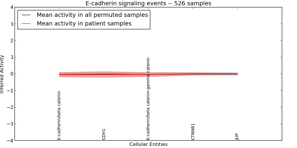 The significance of the IPL obtained for each concept in each patient sample is assessed using a permutation analysis. Importantly, the permutation analysis preserves data tuples so as to preserve any implicit correlations between the different data modalities. For example, genes that are deleted have concomitantly lower expression levels. Preserving the copy number and expression pairs therefore retains this data property. The simulation therefore makes "null samples" by permuting data tuples across all of the genes in the genome so that each gene in a null sample is associated with a random tuple of another gene with equal probability. This approach has the added benefit of preserving the pathway structure so that every observed IPL can be compared to a distribution of random IPLs derived from exactly the same interaction context. PARADIGM inferences are then obtained for 1000 "null" patients and serve as a background distribution to contrast the observed IPLs against. Pathway concepts are excluded from further analysis if they did not obtain a minimum IPL of 0.5 in any patient sample both observed or simulated.