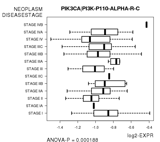 Figure S7. Get High-res Image As an example, this figure shows the association of PIK3CA|PI3K-P110-ALPHA-R-C to 'NEOPLASM.DISEASESTAGE'. P value = 0.000188 with ANOVA analysis.