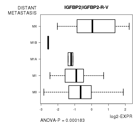 Figure S3. Get High-res Image As an example, this figure shows the association of IGFBP2|IGFBP2-R-V to 'DISTANT.METASTASIS'. P value = 0.000183 with ANOVA analysis.
