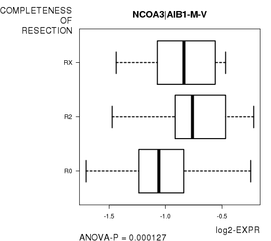 Figure S5. Get High-res Image As an example, this figure shows the association of NCOA3|AIB1-M-V to 'COMPLETENESS.OF.RESECTION'. P value = 0.000127 with ANOVA analysis.