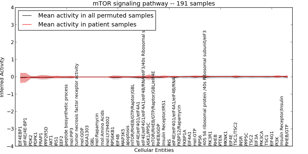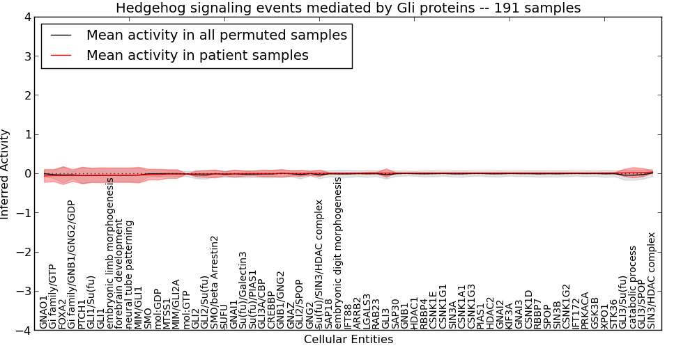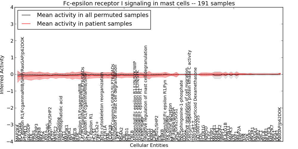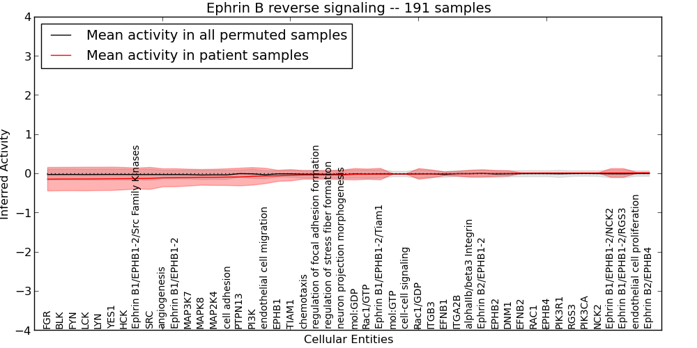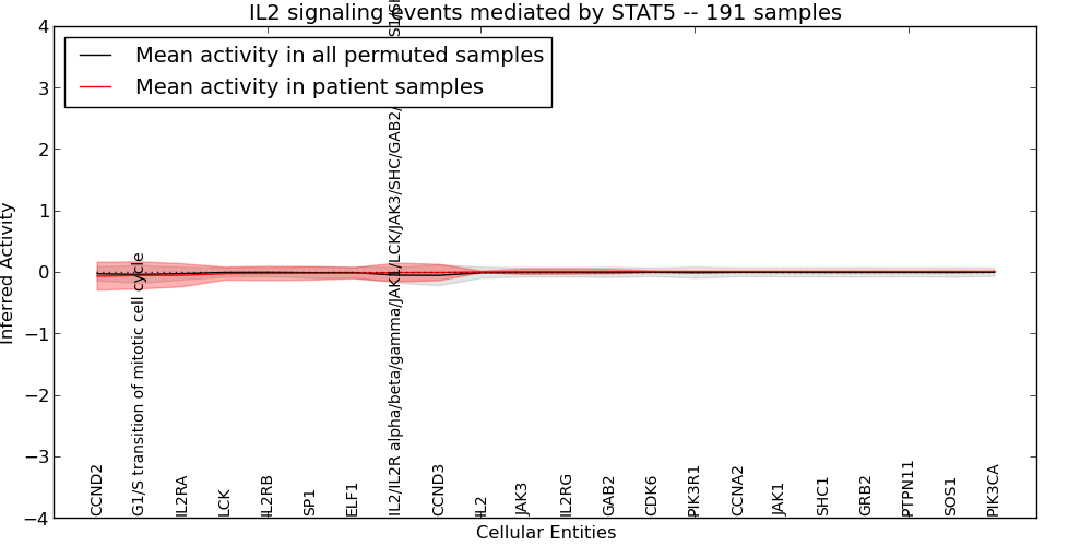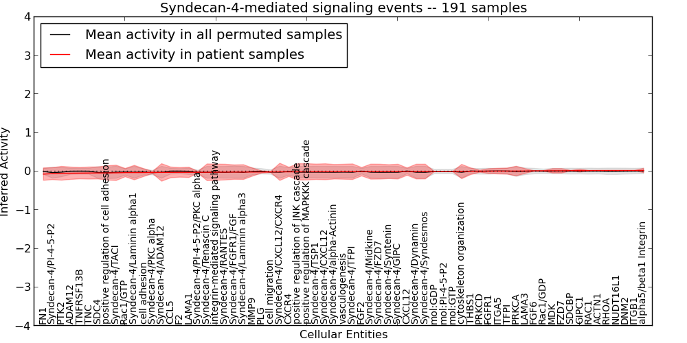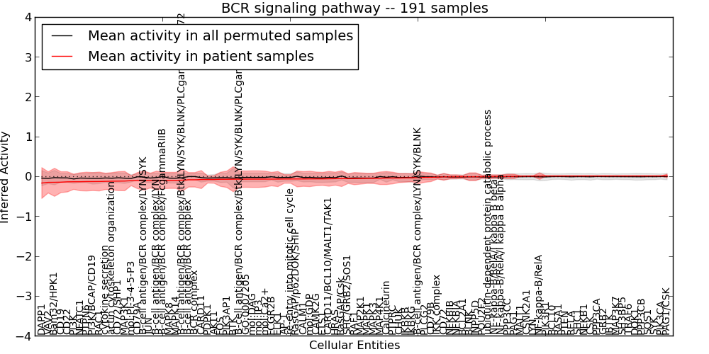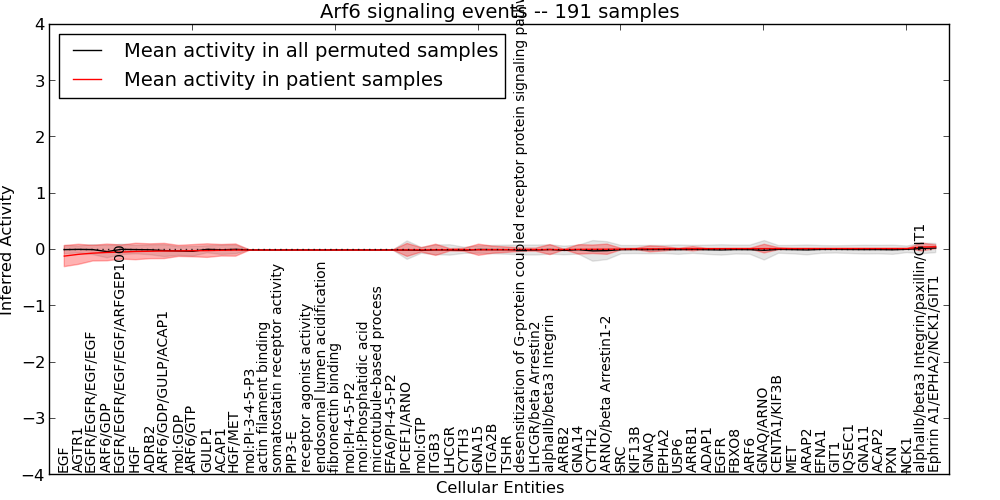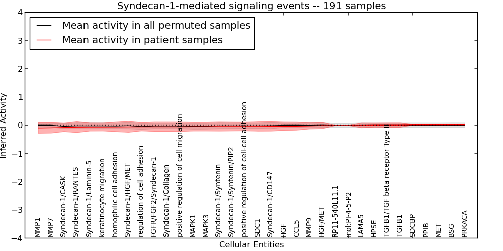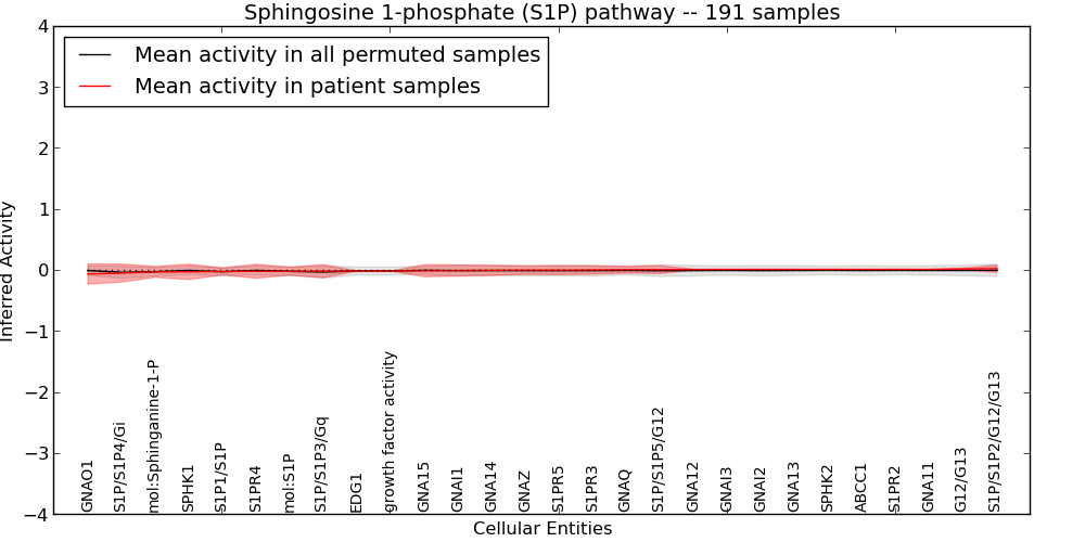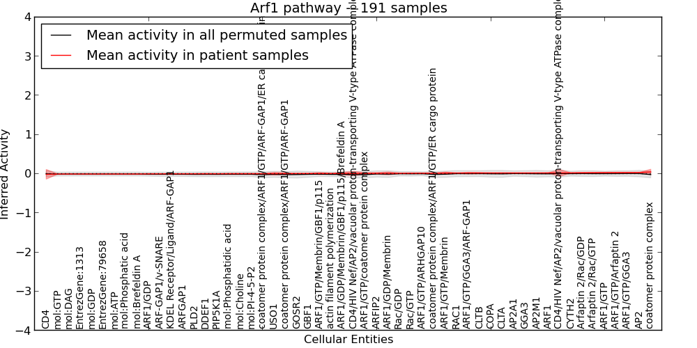Figure S131. Get High-res Image This plot shows pathway concept perturbations across all samples against a permutation model. The concepts along the x-axis are sorted by lowest to highest mean activity for the real patient samples. Mean inferred activities are plotted along the y-axis as a colored band showing the average level and one standard deviation range. Real samples are shown in red and permuted samples in black.