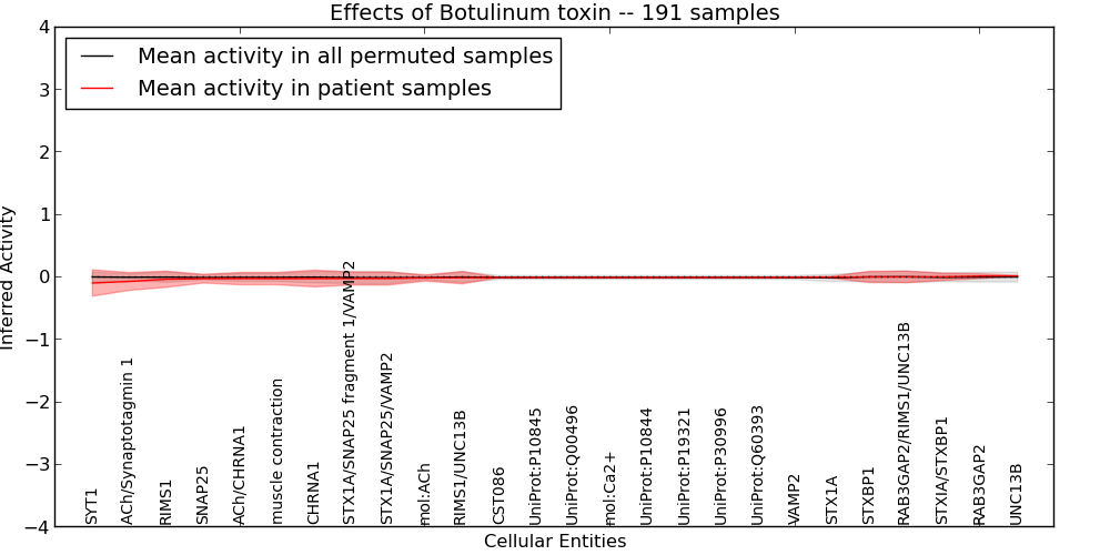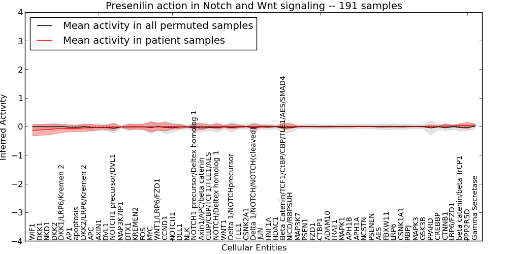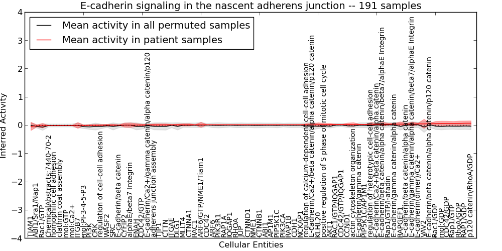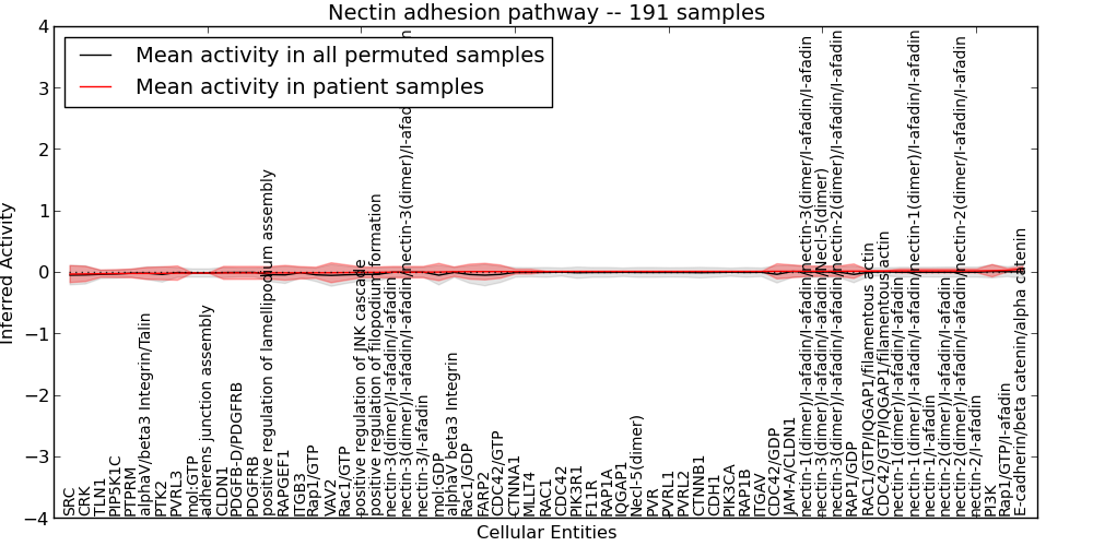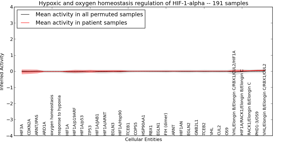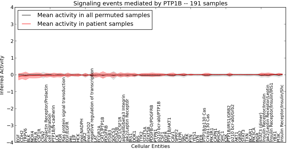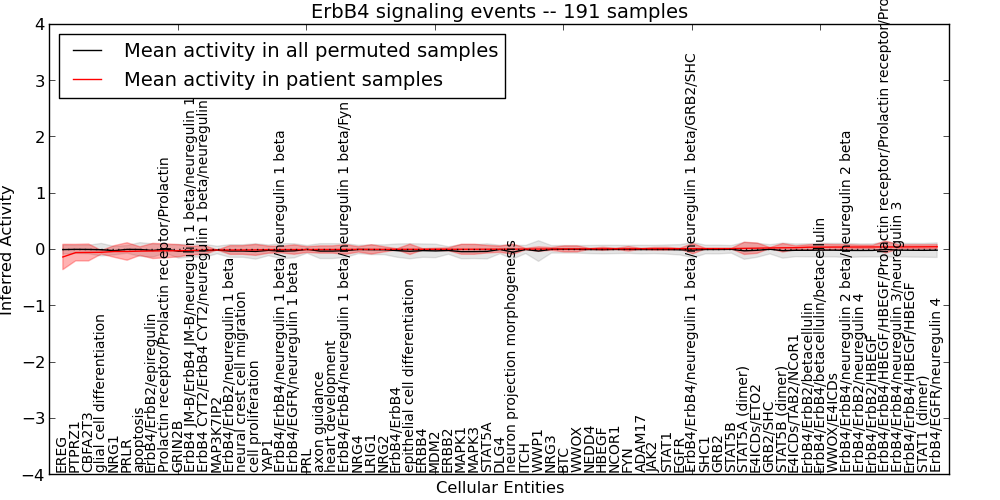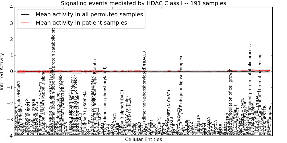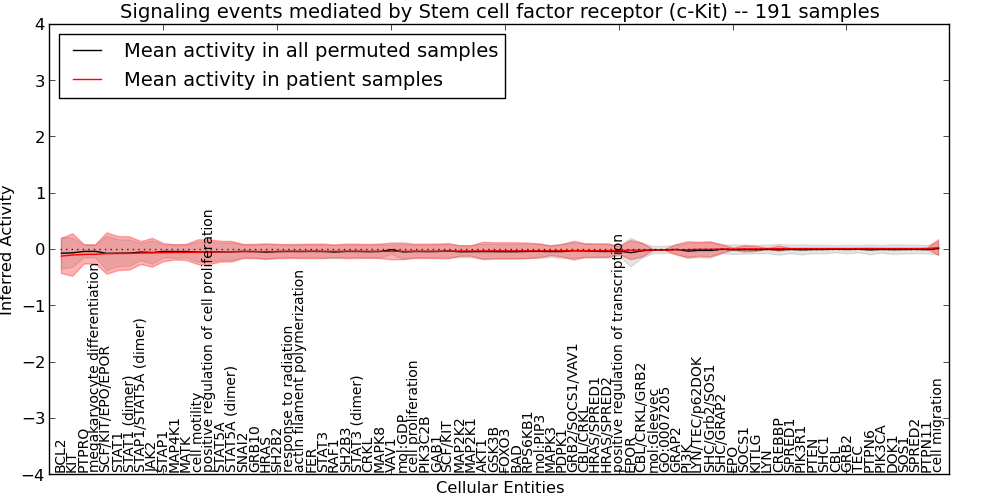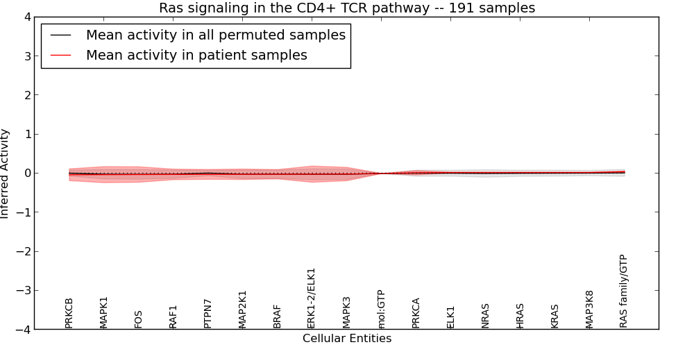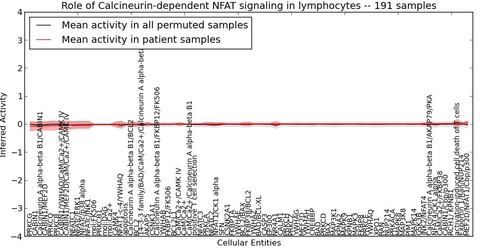 Figure S131. Get High-res Image This plot shows pathway concept perturbations across all samples against a permutation model. The concepts along the x-axis are sorted by lowest to highest mean activity for the real patient samples. Mean inferred activities are plotted along the y-axis as a colored band showing the average level and one standard deviation range. Real samples are shown in red and permuted samples in black.