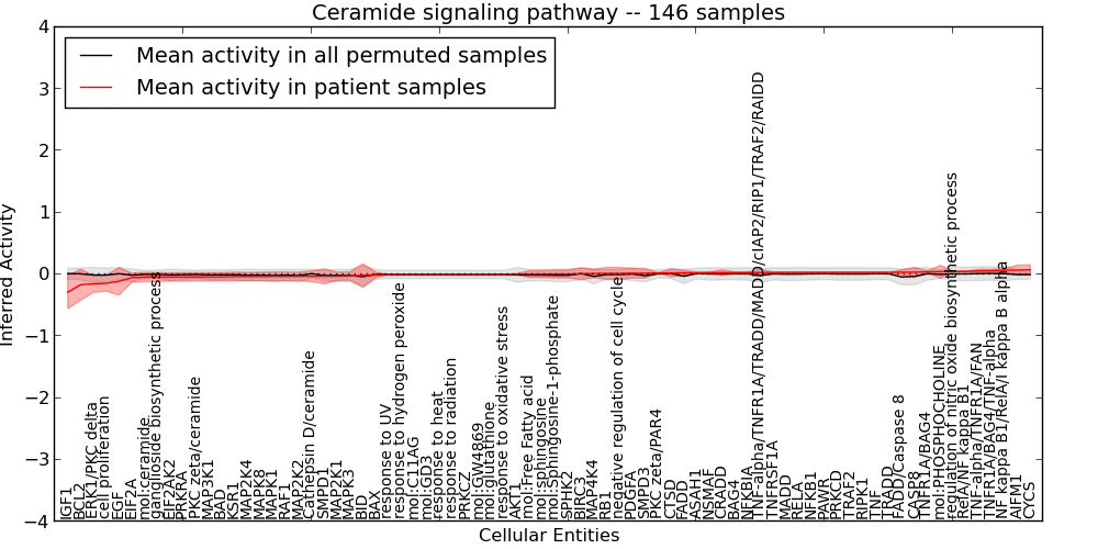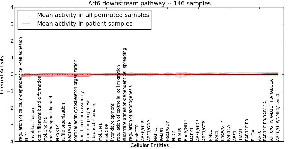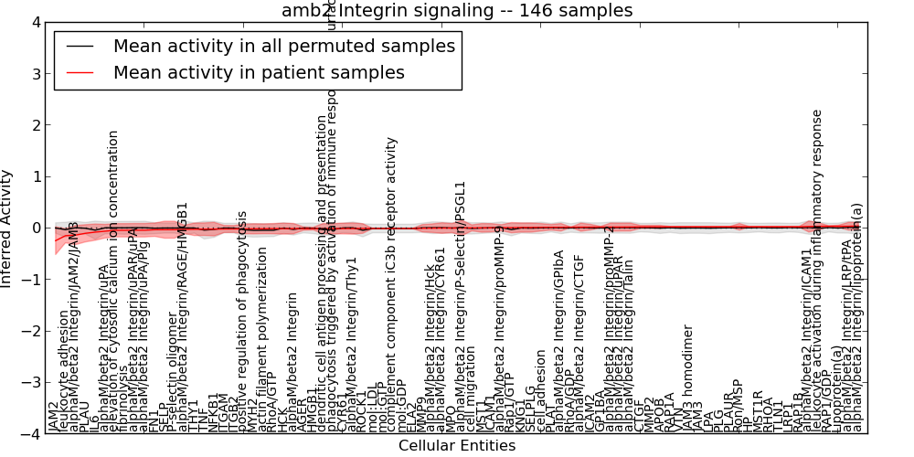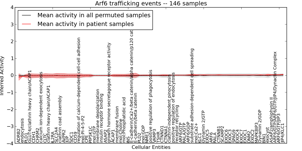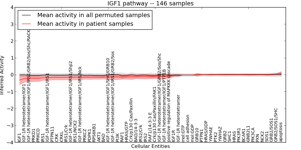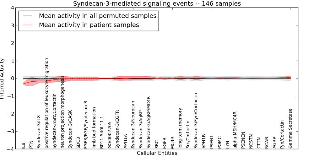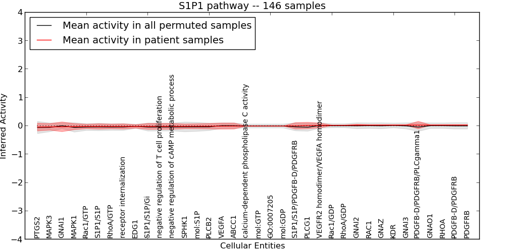 Figure S130. Get High-res Image This plot shows pathway concept perturbations across all samples against a permutation model. The concepts along the x-axis are sorted by lowest to highest mean activity for the real patient samples. Mean inferred activities are plotted along the y-axis as a colored band showing the average level and one standard deviation range. Real samples are shown in red and permuted samples in black.