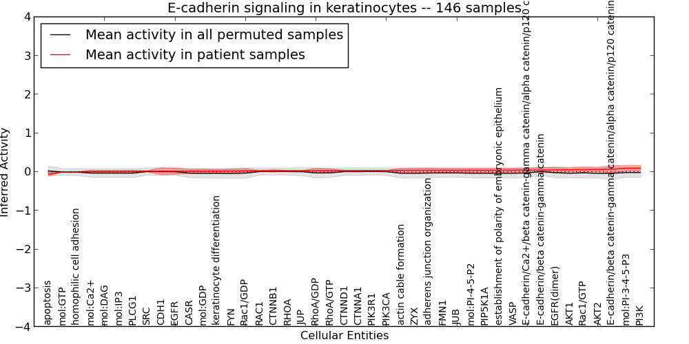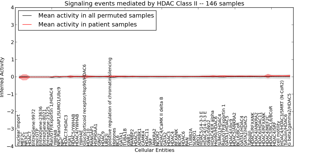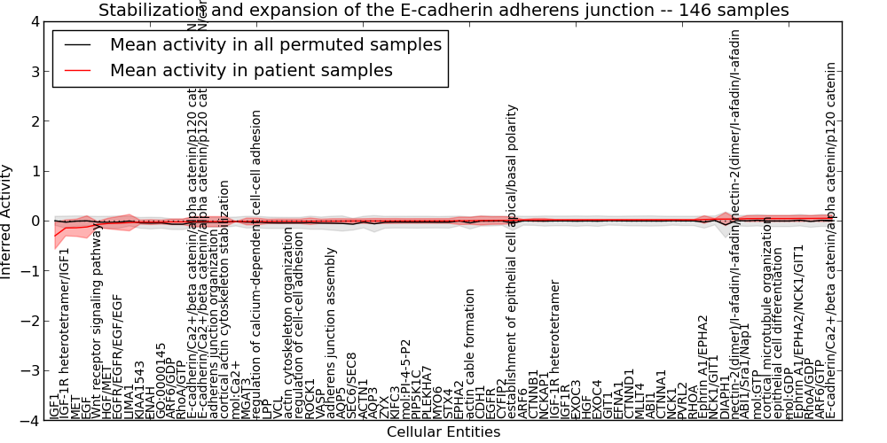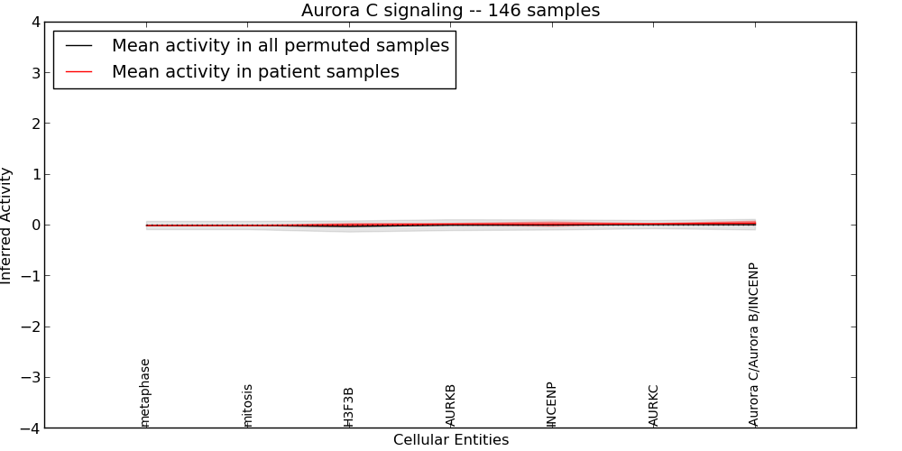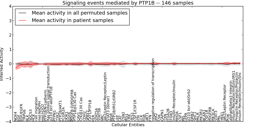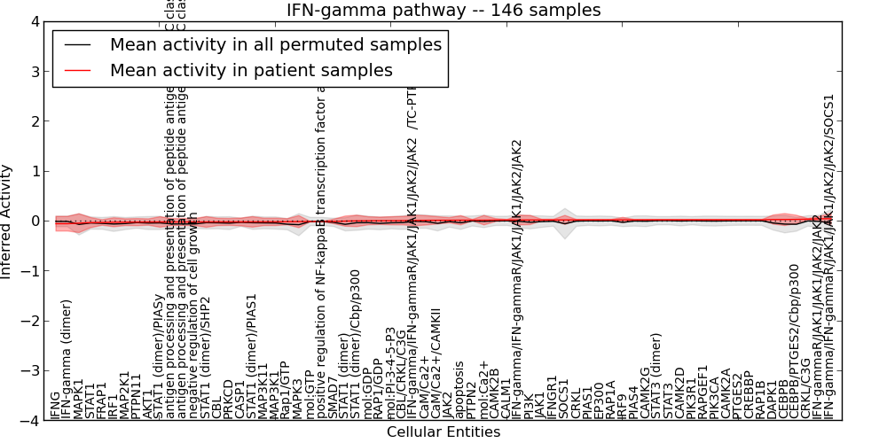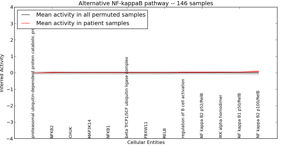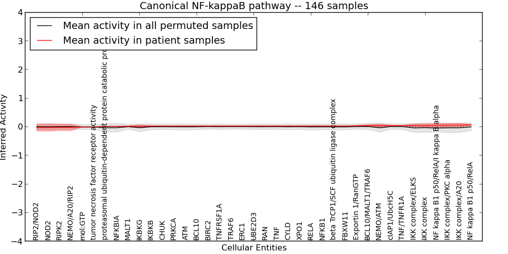 Figure S130. Get High-res Image This plot shows pathway concept perturbations across all samples against a permutation model. The concepts along the x-axis are sorted by lowest to highest mean activity for the real patient samples. Mean inferred activities are plotted along the y-axis as a colored band showing the average level and one standard deviation range. Real samples are shown in red and permuted samples in black.