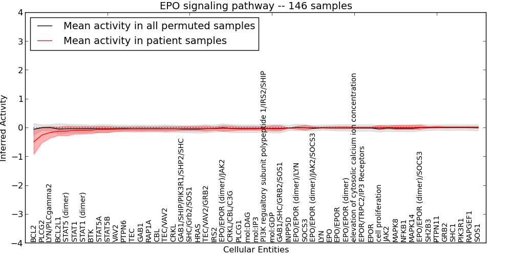 Figure S131. Get High-res Image This plot shows pathway concept perturbations across all samples against a permutation model. The concepts along the x-axis are sorted by lowest to highest mean activity for the real patient samples. Mean inferred activities are plotted along the y-axis as a colored band showing the average level and one standard deviation range. Real samples are shown in red and permuted samples in black.