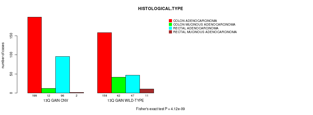 13q gain cnv correlated to 'HISTOLOGICAL.TYPE'.