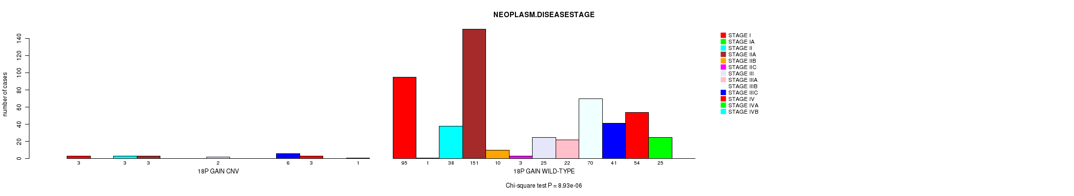 Figure S8. Get High-res Image Gene #32: '18p gain' versus Clinical Feature #12: 'NEOPLASM.DISEASESTAGE'