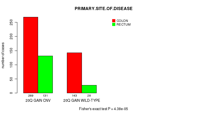 20q gain cnv correlated to 'PRIMARY.SITE.OF.DISEASE' and 'HISTOLOGICAL.TYPE'.